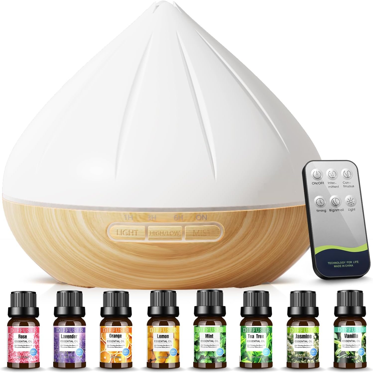 Essential Oil Diffuser, 500ml Aromatherapy Diffuser with 8x10ml Essential Oils Set, Aroma Diffusers for Home, Humidifier for Bedroom, Remote Control Air Fresheners Diffuser with 14 Color LED Lights
