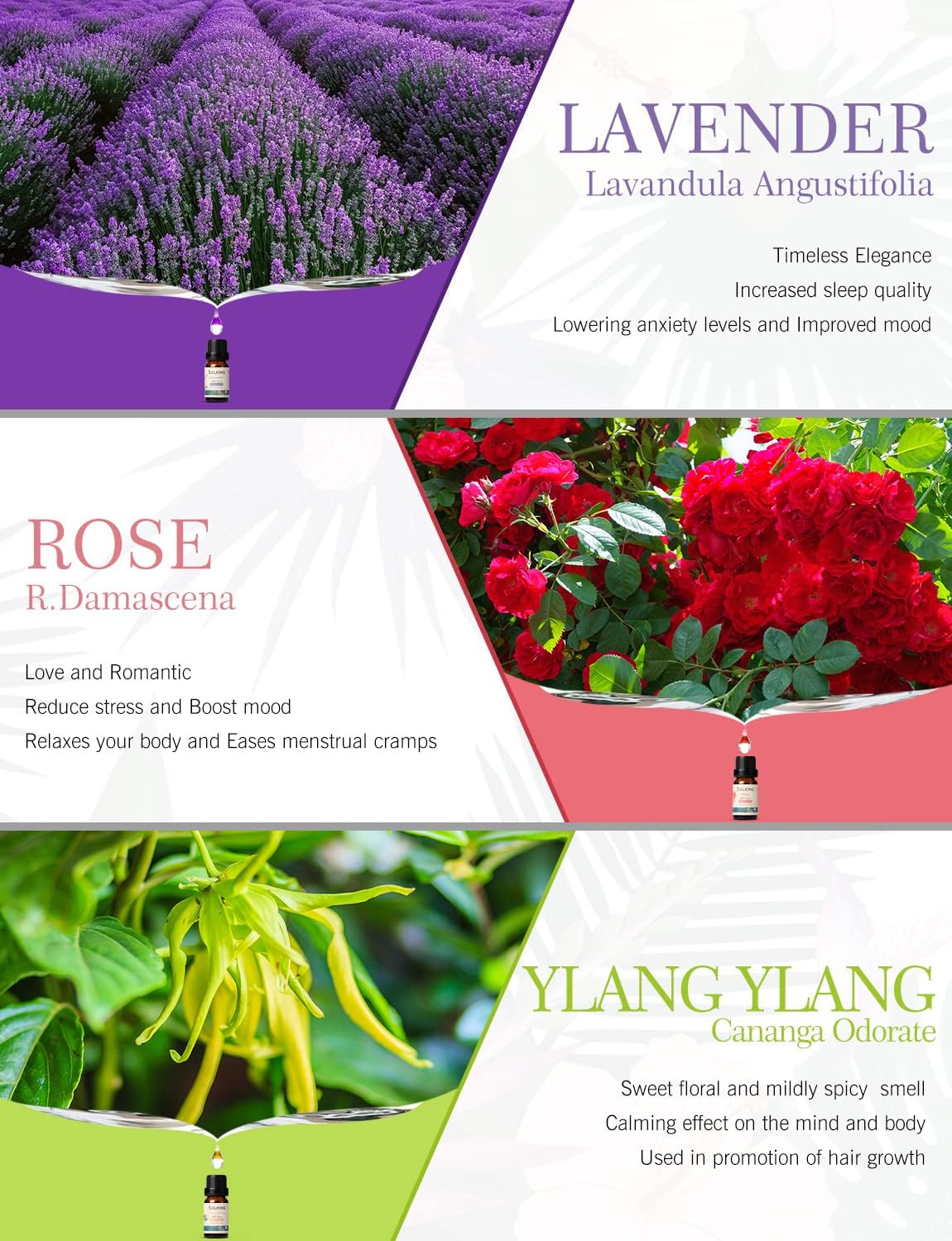 🌺 Top 6 Essential Oils – SALKING aromatherapy essential oil set Included Lavender, Rose, Cherry Blossom, Ylang Ylang, Gardenia, Chamomile. In particular, a oils gift set contains both lavender and rose flavors,nobody tried before.SALKING is first and only one .We have kinds of essential oils for you to meet your different needs and also you can DIY to blend them to create new scents.