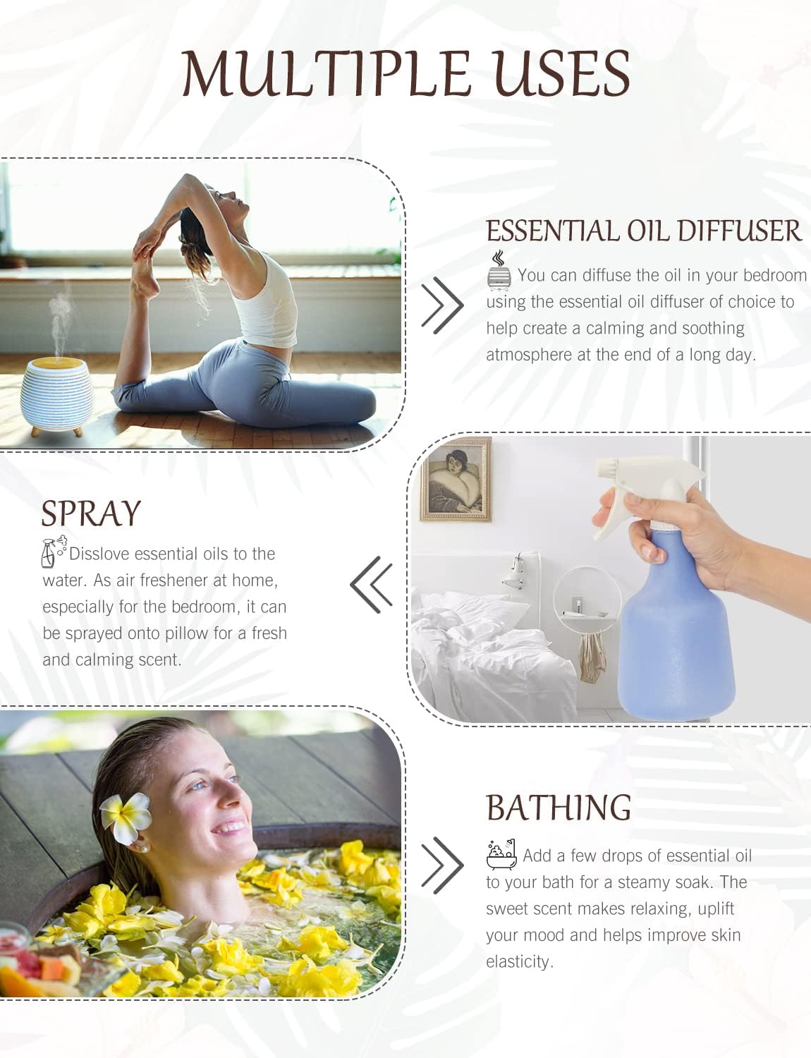 🌺 Various Uses – A few drops to your diffuser, vaporizer or humidifiers, then you get Intense and long lasting fragrance. A great choice for massage (combine with a carrier oil), steam inhalations, hot bath, saunas, air freshening, etc. Its many forms include oils, gels, lotions, soaps, shampoos, sprays, and candle making.