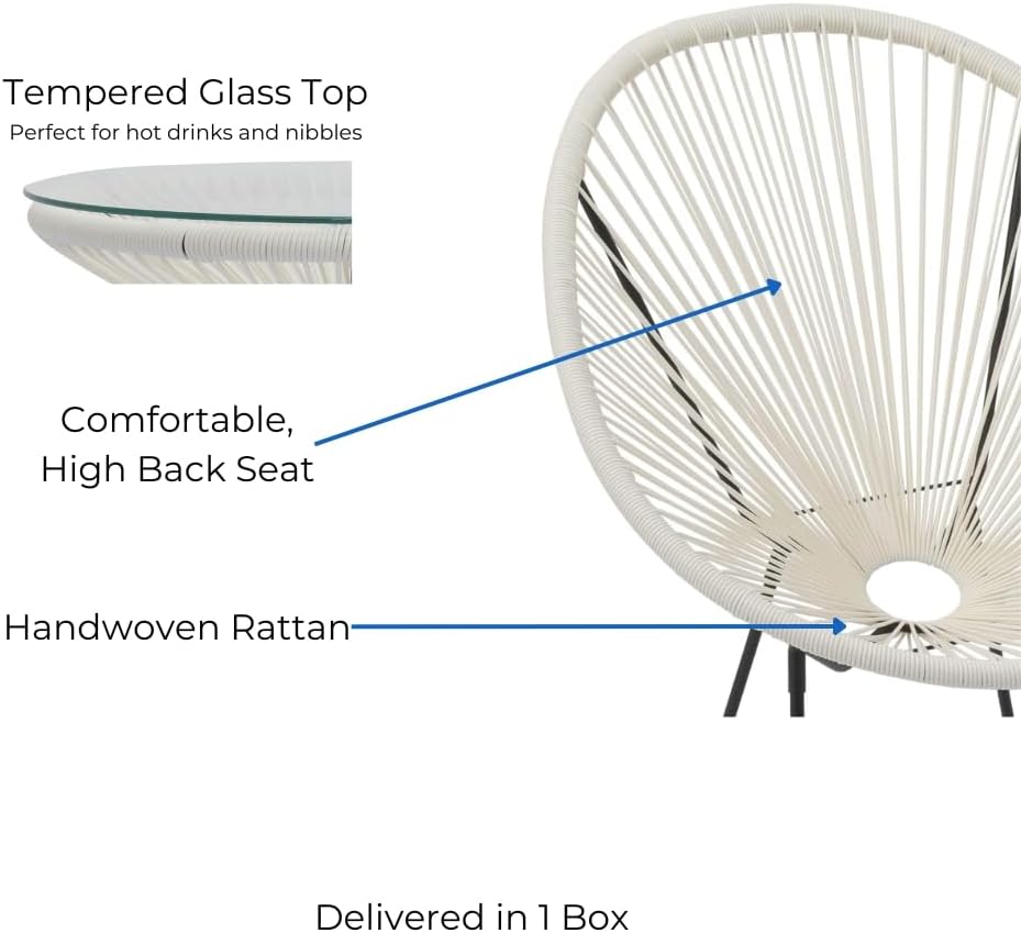 Specifications: Furniture arrives flat-pack in a single box and will require assembly. Assembly of the set is very easy and a full instruction manual is provided with every purchase. Maximum weight allowance of the set is up to 110kg per seat. Dimensions approx in cm: Chair (WxDxH): 72x68x79, Seat height: (WxD): 31.5×38, Seat depth: 41cm, Backrest: 57cm, Table:(ØxH): 50.5 x 47.5.