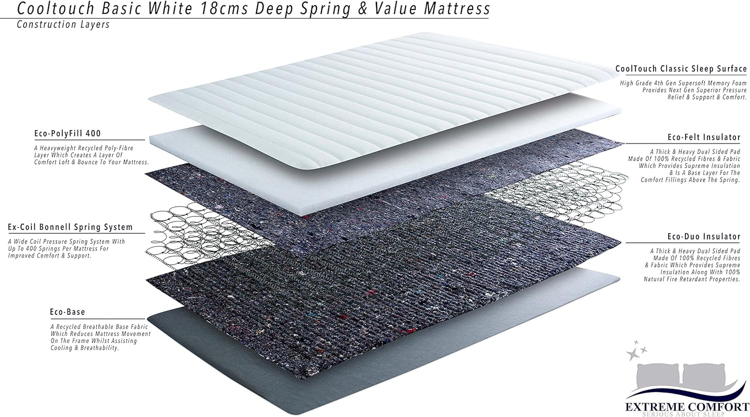 eXtreme comfort ltd – The Cooltouch Essentials White 18cms Deep Spring Value Mattress, Soft Feel 3ft Single (3ft x 6ft3, 90cm x 190cm)
