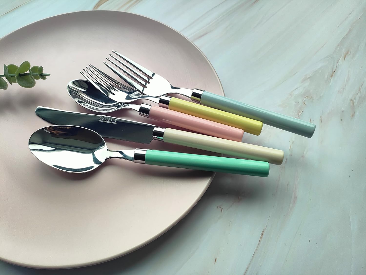 Exzact stainless steel cutlery set of 20pcs – serve for four – 4 x dinner forks, 4 x dinner knifes, 4 x table spoons, 4 x salad forks, and 4 x tea spoons. It includes 20 pieces of cutlery in total, with each piece featuring a handle in one of five different colors (yellow, blue, cream, turquoise, and pink).