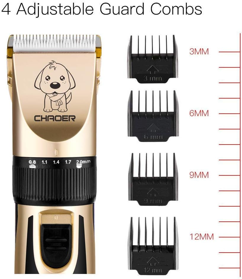 【4 guard combs 】(3mm/6mm/9mm/12mm). The adjustable clipping comb is applicable for clipping hair of different lengths; and the detachable guide combs make for quick, easy comb changes and increased versatility.