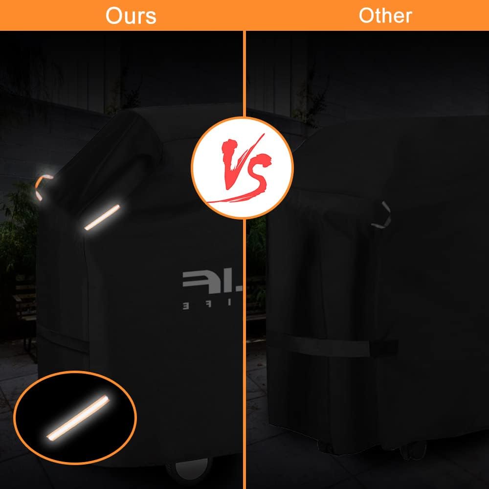 【Upgraded Windproof Design & Reflective Handles】The gas bbq cover has two adjustable Velcro straps on the side, you can adjust a better size to suit your grill or keep the BBQ Cover taut from blowing off in the wind; the bottom of the bbq covers has a nice drawstring which can tight the barbecue cover from windy weather; 4pcs Reflective strip part on the top make it easy and quick to place, remove, or store the grill cover, also a safe warning at night.