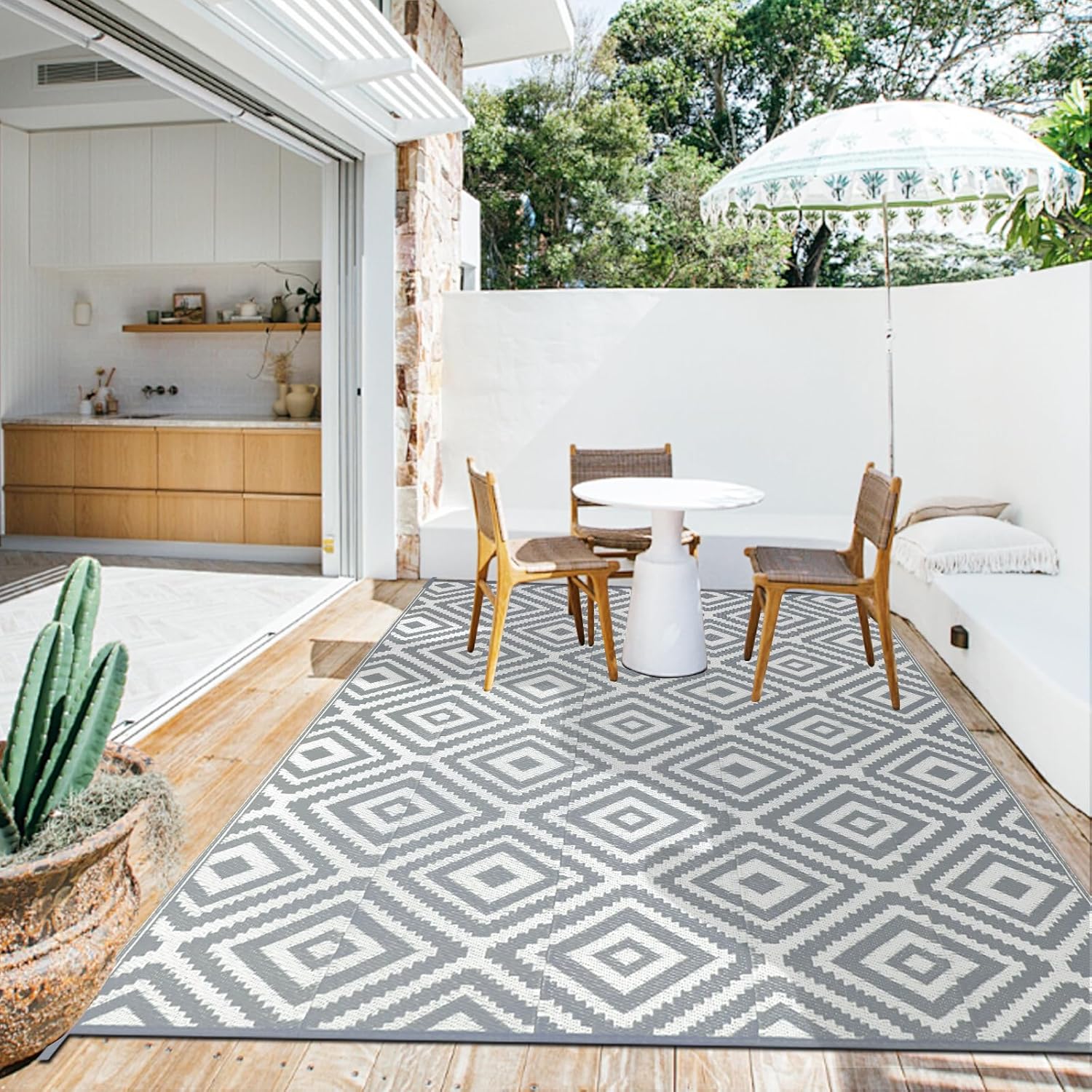 Recycled plastic outdoor rug: reversible outdoor rug for patio are tightly woven from straws made of premium quality recycled plastic for durability and strength.Outdoor patio rug are hard-wearing tear-resistant also softness and comfort underfoot. And not hurt grass or scratch your deck. with high end design, bring beautity and trendy