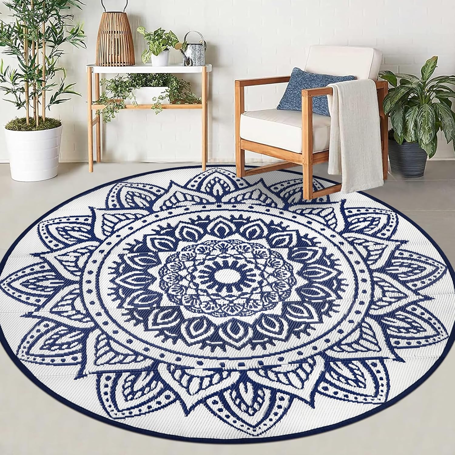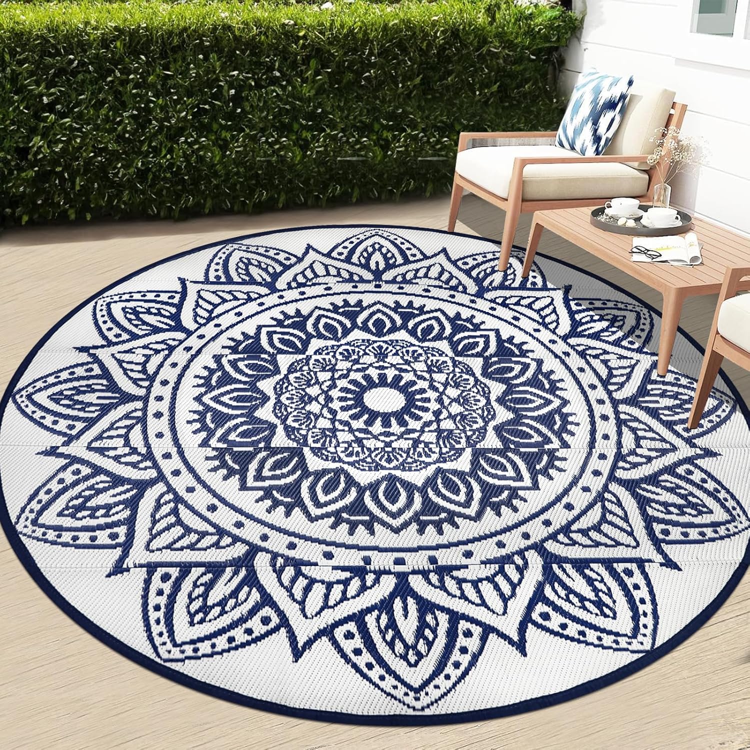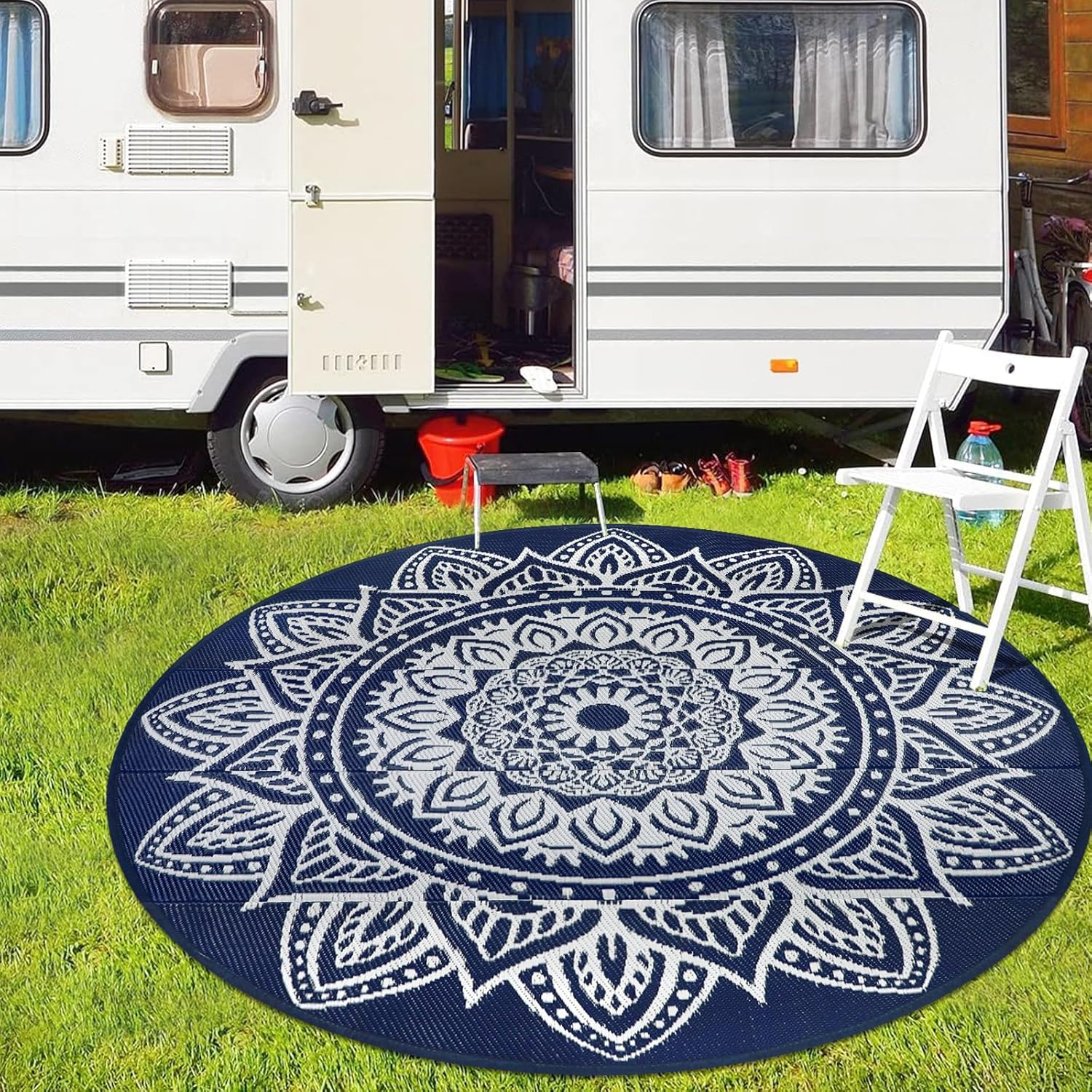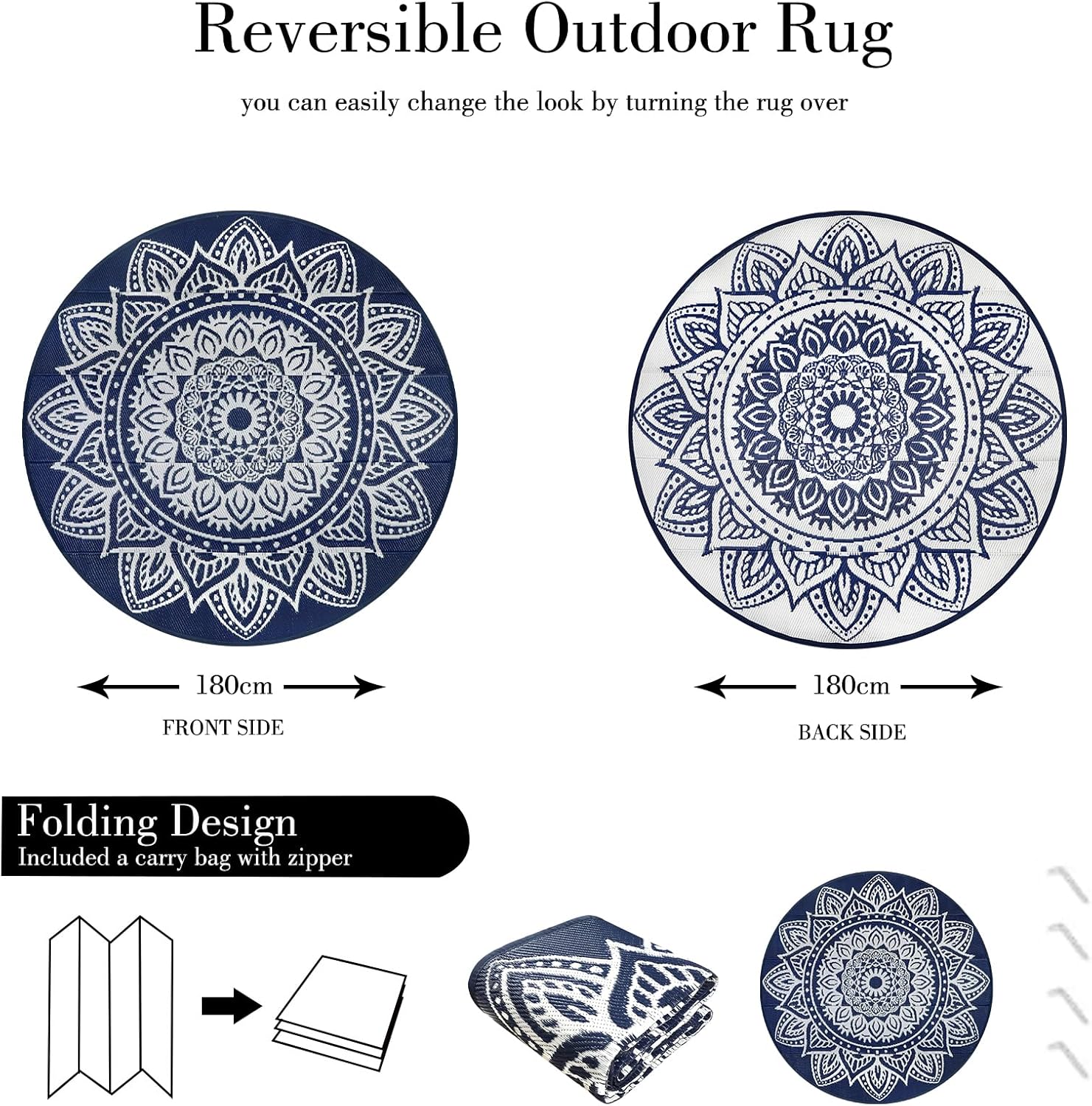 Famibay Outdoor Rugs for Patios Waterproof Graden Rug Round 180cm Camping Rug Reversible Plastic Rug Lightweight Picnic Blanket Outdoor Carpet for Balcony Deck Backyard Porch Beach BBQ