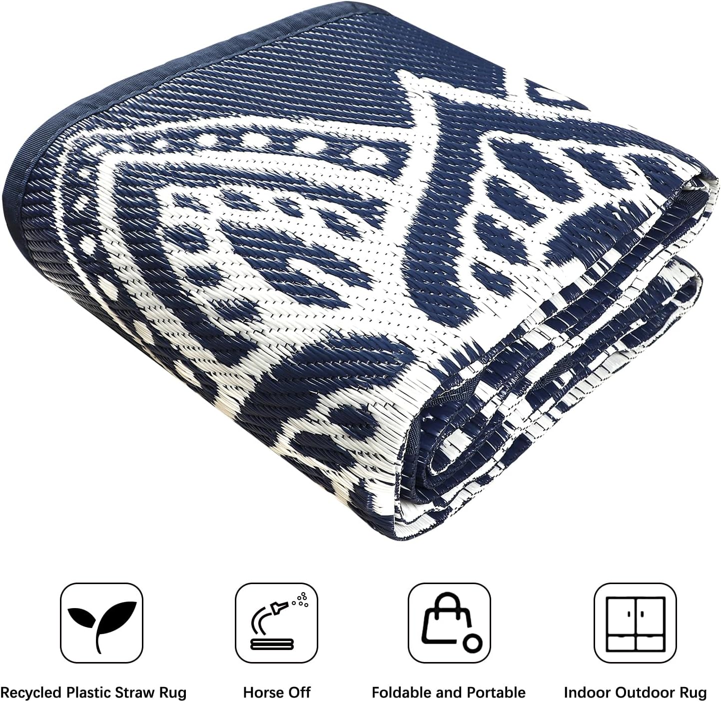 Versatile outdoor camping rug: Our deck rug is designed to be both stylish and functional.With trendy design, the garden rug adds a touch of elegance making it suitable for a variety of spaces and purposes, such as ,patio,deck,garden,backyard,beach, BBO,picnic,camping, porch.The woven floor mat comes in folded status,putting something heavy on it if there are creases. Any concerns or suggestions, please contact us