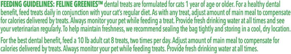 FELINE GREENIES Savory Salmon Flavor Dental Cat Treats were designed to help keep your cat’s mouth clean and healthy. With their unique shape and crunchy texture, these treats are proven to clean teeth and reduce tartar. Plus, these irresistible little cat chews also work to freshen cat breath, letting you both enjoy cuddle time even more. But because these natural cat treats have added vitamins, minerals, and taurine, they do more than just offer cat teeth care… they offer complete, tasty nutrition, too. As the #1 vet-recommended feline dental treat,* FELINE GREENIES are the healthy, low-calorie cat teeth cleaning treats you’ve been looking for. Give your cat FELINE GREENIES Dental Treats and you’re sure to stir up fresh, healthy, happy purrs of joy. FELINE GREENIES: for healthy and happy dental and oral care. * Among U.S. veterinarians who recommend dental treats for at-home oral care