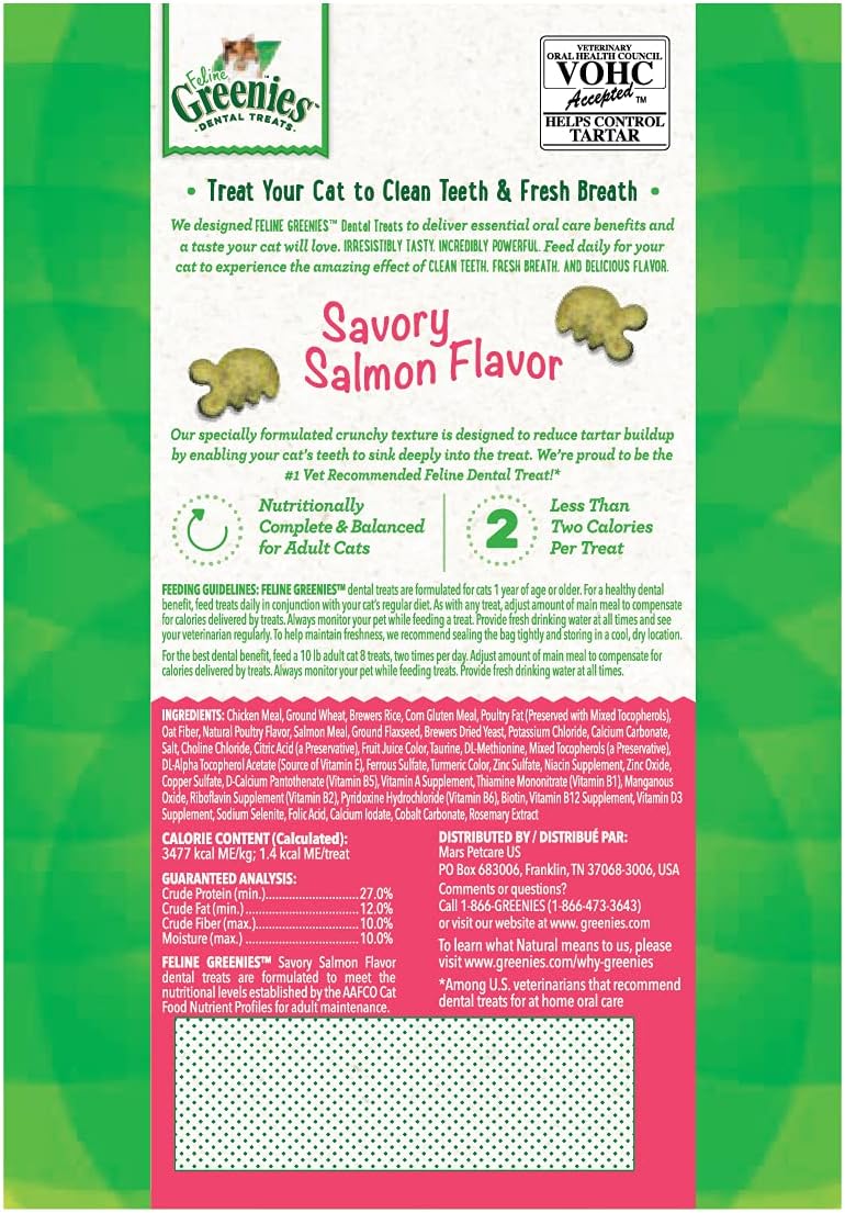 Contains one (1) 2.5 oz. pouch of FELINE GREENIES Natural Dental Treats for Cats Savory Salmon Flavor; Natural Cat Treats Plus Vitamins, Minerals, and Other Nutrients