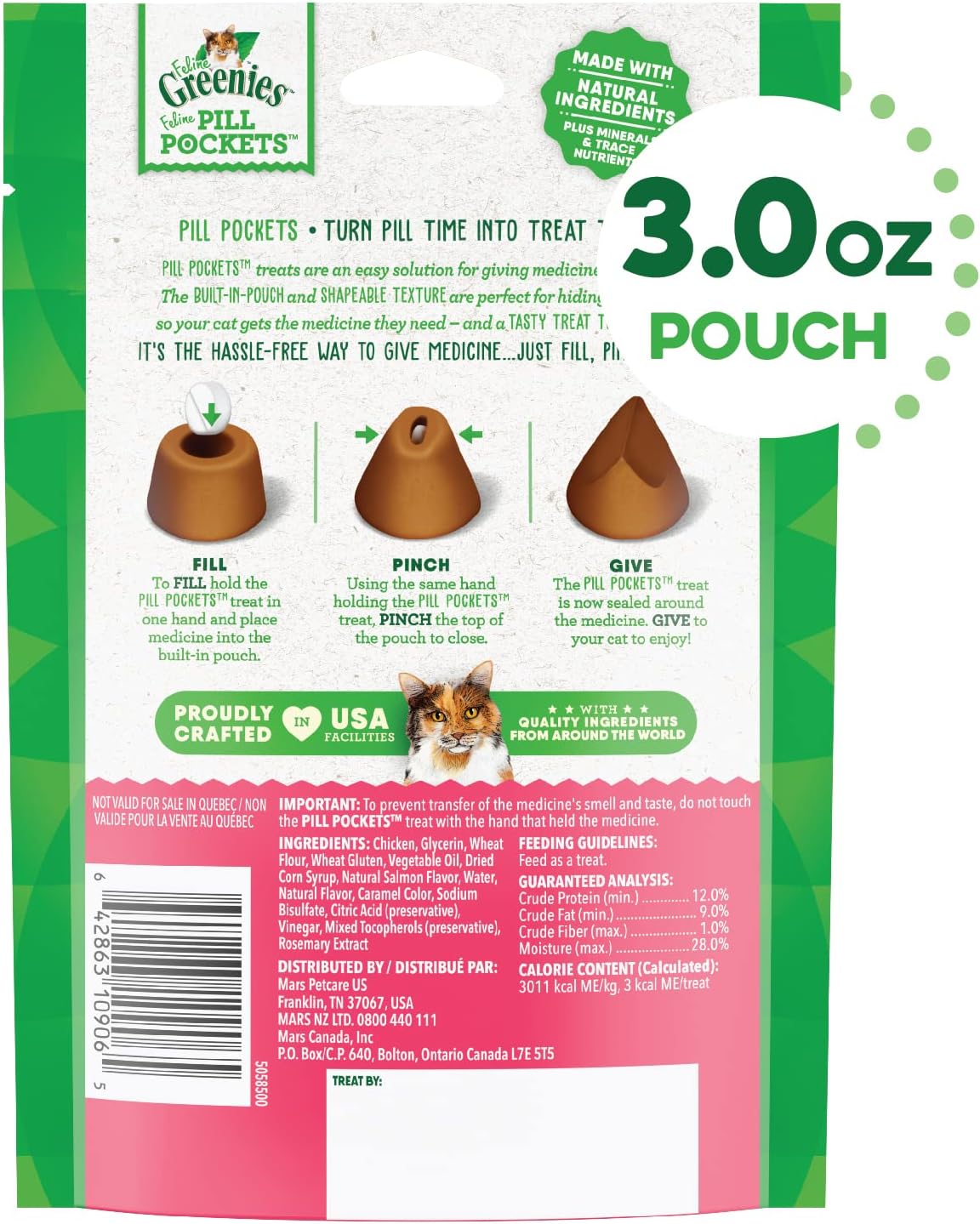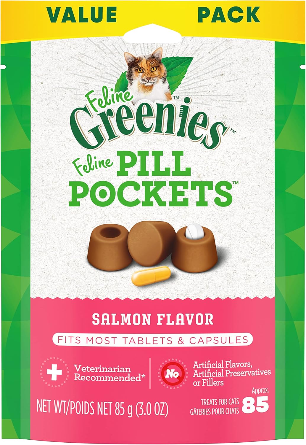 Contains one (1) 3 oz. 85-count value size pack of FELINE GREENIES PILL POCKETS Natural Cat Treats Salmon Flavor that are perfect for medicine tablets or capsules; MADE WITH NATURAL INGREDIENTS plus trace nutrients