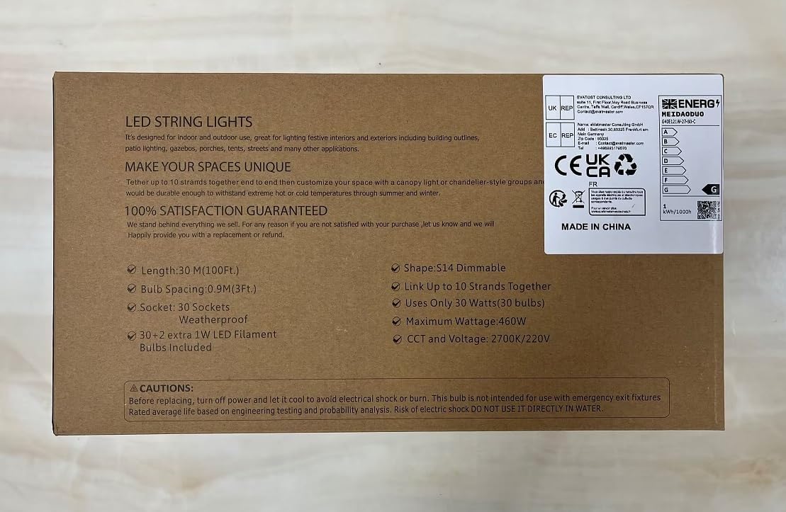 What you get in the box with this Outdoor Festoon String Lights? 1. 30M festoon String Lights contains 30 Waterproof E27 Lampholders 2. 30pcs LED Shatterproof S14 bulbs screwed into sockets+2pcs spare bulbs 3. A User Manual
