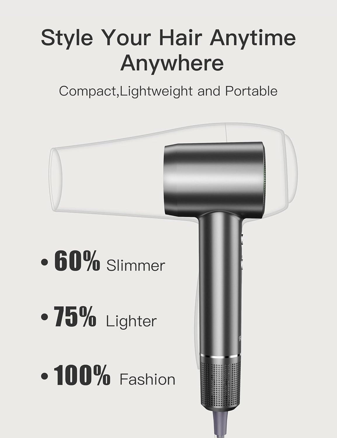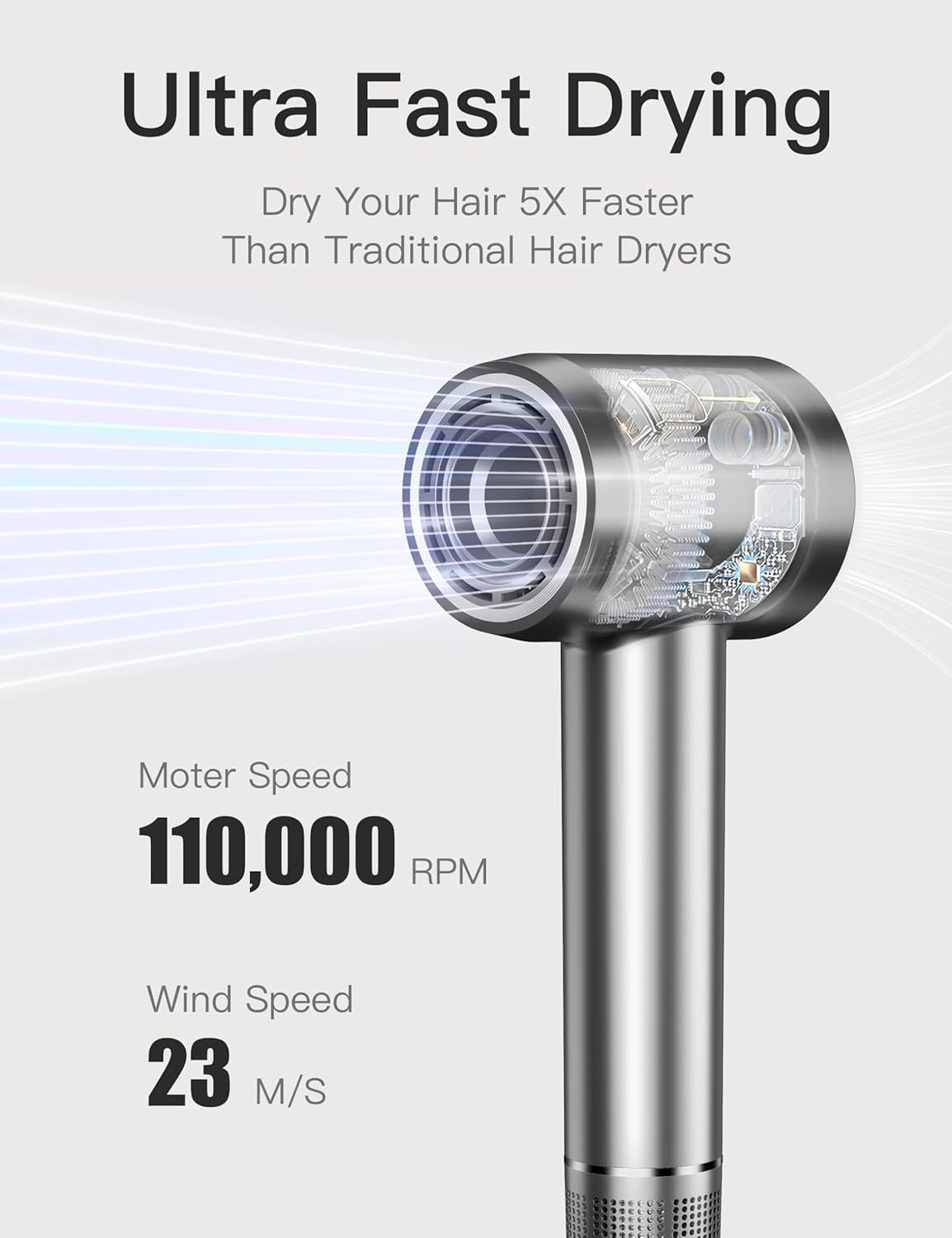 【Ultra fast drying and no heat damage】The Fezax hair dryer is equipped with a high speed brushless motor with 110,000 rpm, providing a strong wind speed of 23 m s, which can dry your hair in a short time and is 5x faster than traditional hair dryers. Our intelligent temperature control processor built into the hair dryer, which monitors the heat output 100 times per second in real time and regulates the temperature, prevents your hair from being damaged by high temperatures