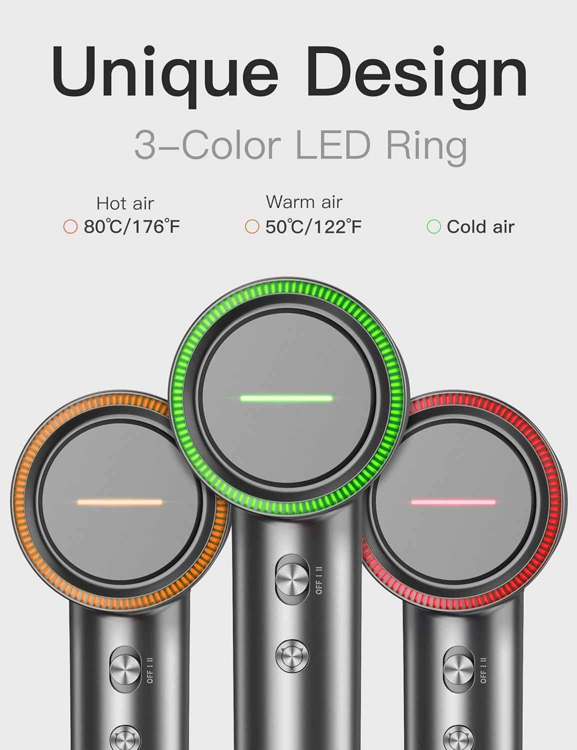 【2 Speed Control & 4 Heat Settings】Our hair dryer has 2 speed controls and 4 heat controls . There are 4 different LED lights built in and you can switch the LEDs to different colors by pressing the heat button. Red means hot air, yellow means warm air and green means cool air. Press and hold the button for 3 seconds to activate the cyclic mode to help you with styling