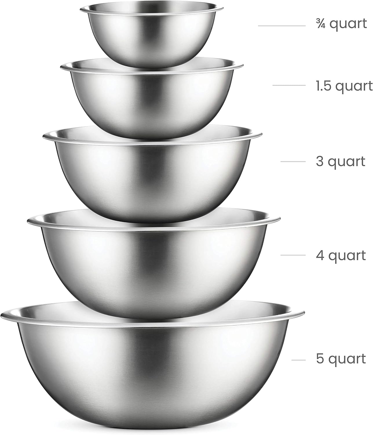 DRIP-FREE POURING – All 5 stainless steel mixing bowls feature wide rims for drip-free pouring and a solid grip. A flat base also provides stability with matching handled lids that sit flush for a snug fit.