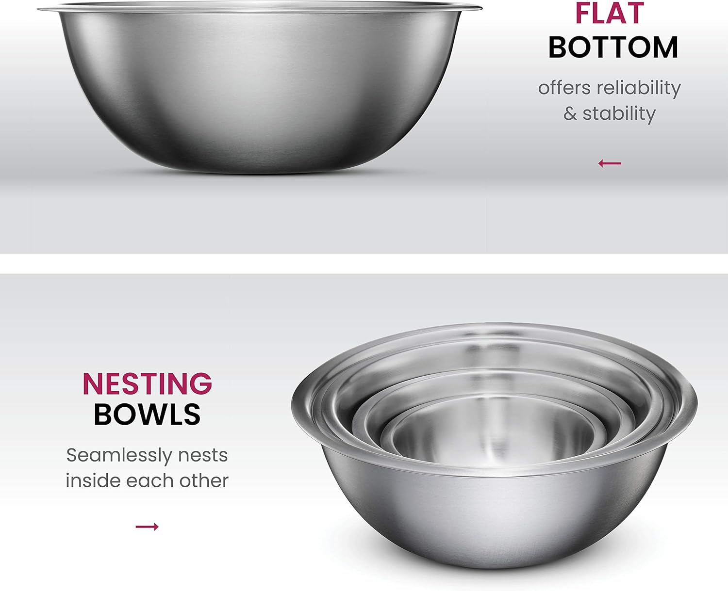 CONVENIENT – A tidy kitchen calls for this dishwasher-safe stainless steel bowl set. They’re easy to clean, stackable, and seamlessly nest together to ensure no extra clutter causes chaos in your cupboard.