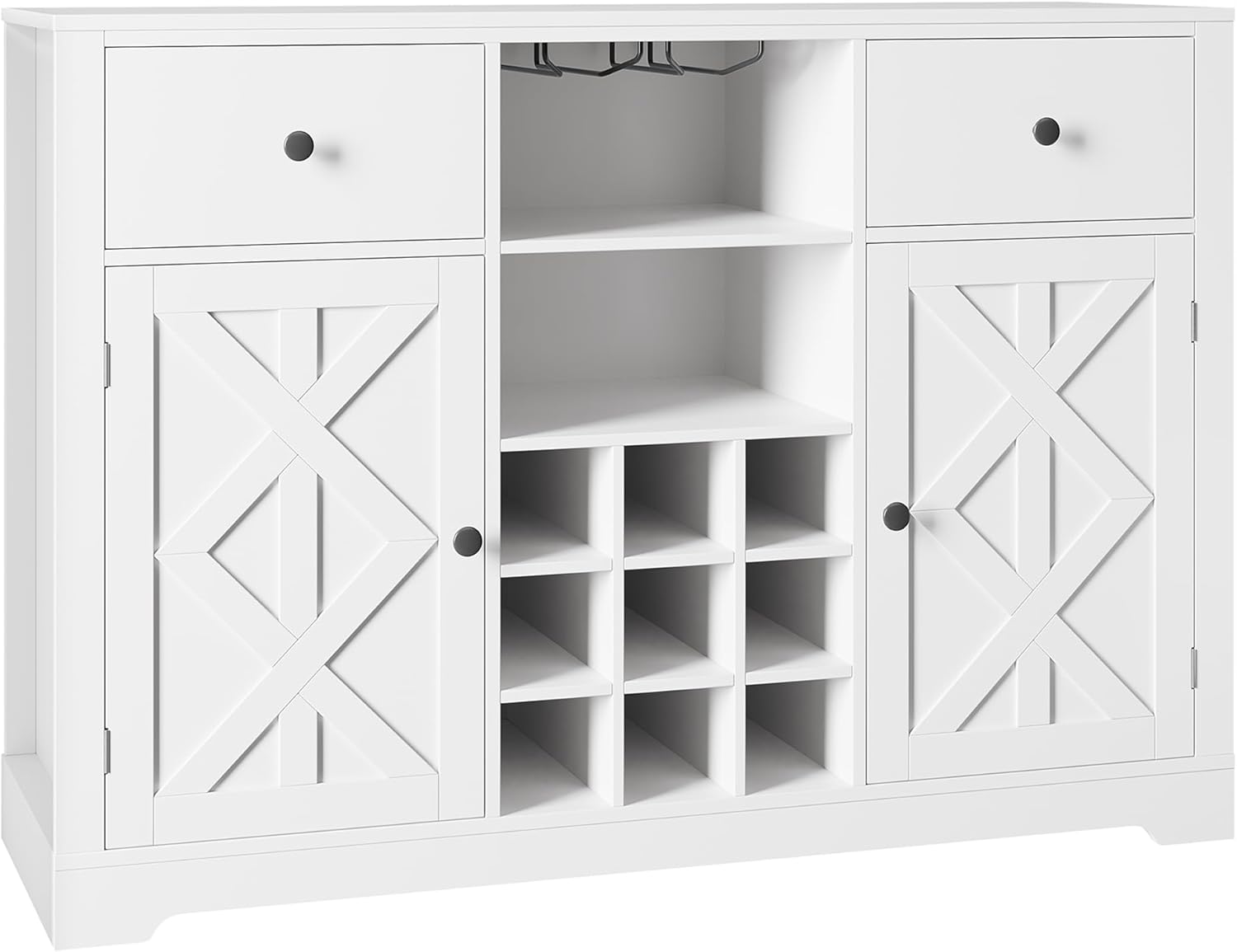 FirFurd White Sideboard, 120cm Kitchen Cabinet, Kitchen Sideboard Storage Cabinet, Drinks Cabinet with Wine and Goblet Holder, 2 Drawers, 2 Doors for Dining Room 120x40x87cm