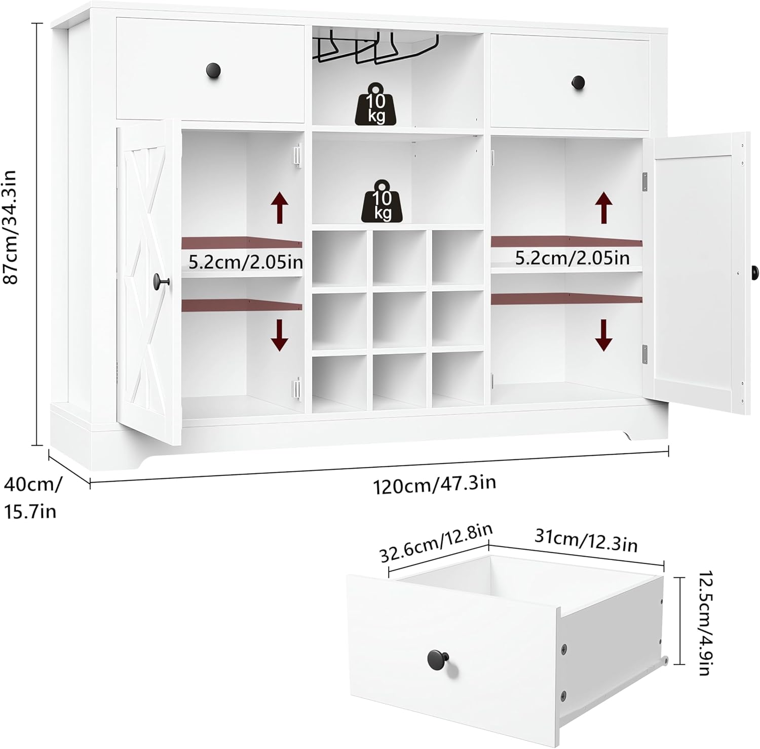 【Diversified Storage Solution】: This kitchen sideboard has 2 drawers, 2 open shelves, 2 storage areas with doors, a wine rack and 2 wine glass holders, providing sufficient space to store bowls, glasses, cutlery and other kitchen items. In addition, the wide worktop of this drinks cabinet measuring 120x40cm is a perfect placement area for fruit plates, coffee makers and microwaves.