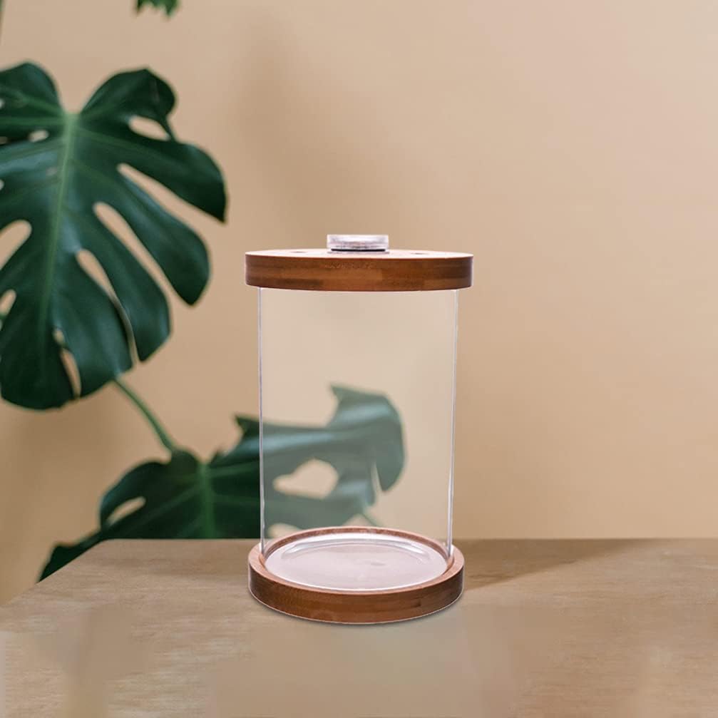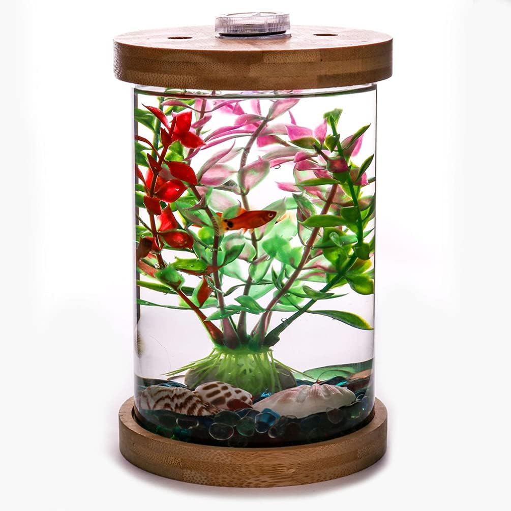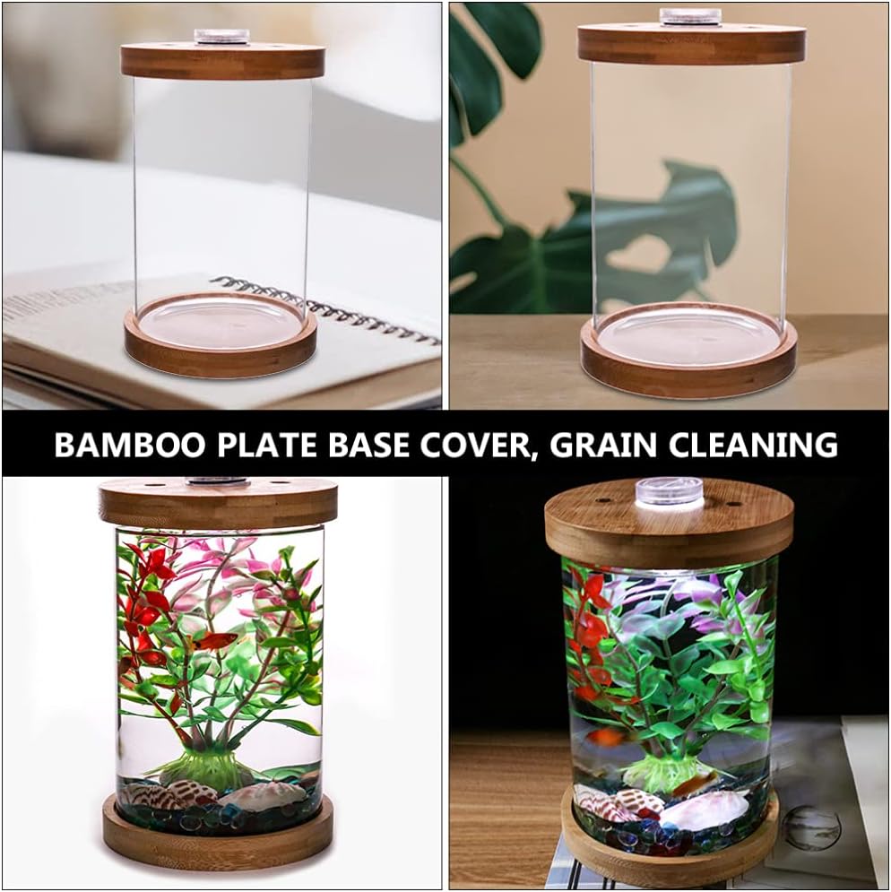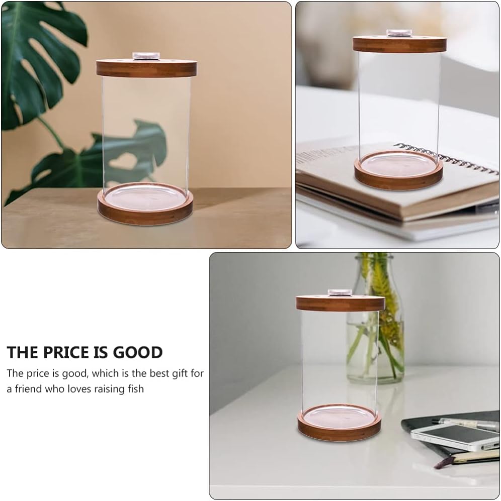 Fish Bowl with LED Lighting Glass Display Dome Cloche Mini Fish Tank Betta Aquarium with Bamboo Base for Home Living Room Bedroom Office Decoration Brown