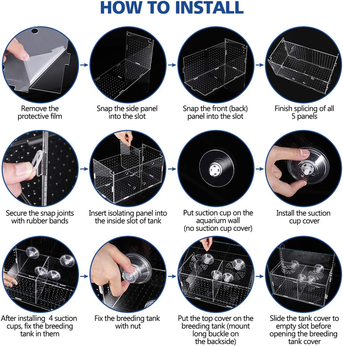 With suction cup and hanging hook, this tank can be installed by two ways, and the height is adjustable. It’s easy to install in the place of fish tank where you want. (First time you should remove protection layers from acrylic fish breeding box.)