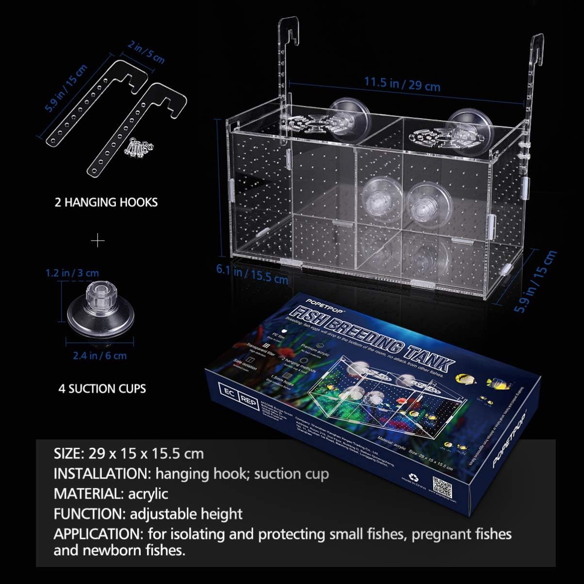 Size & Material – 11.5″ x 5.9″ x 6.1″/ 29 x 15 x 15.5 cm. This fish breeding box is made of transparent acrylic, safe and secure tank for breeding, isolating or acclimating fish. You can clearly observe inside condition.