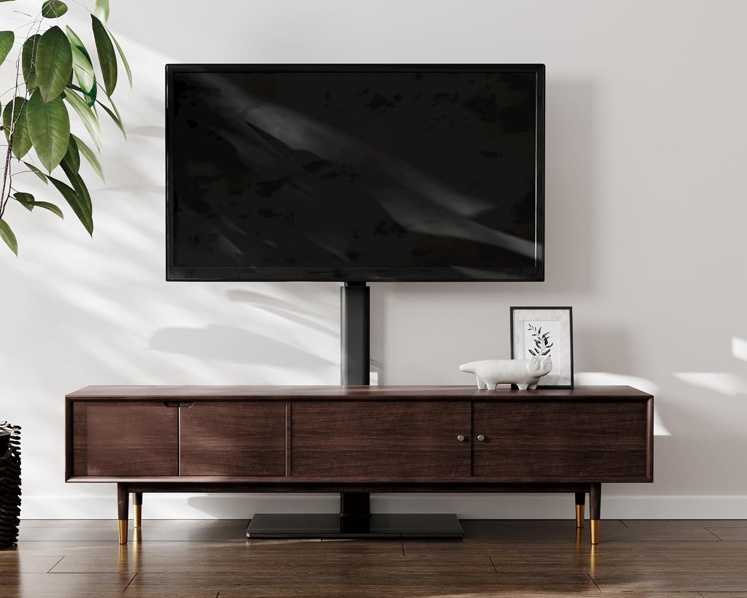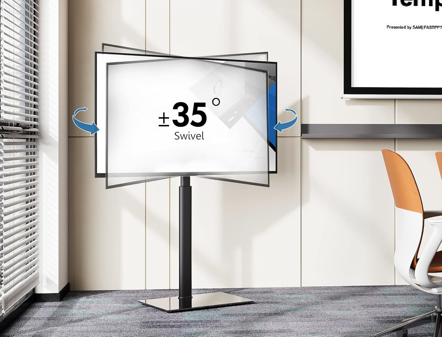 【Smooth Swivel Functionality】The floor TV stand features a swivel mount with a 70-degree left-to-right rotation capability, enabling you to effortlessly angle your TV for optimal viewing from multiple seating positions in your room.
