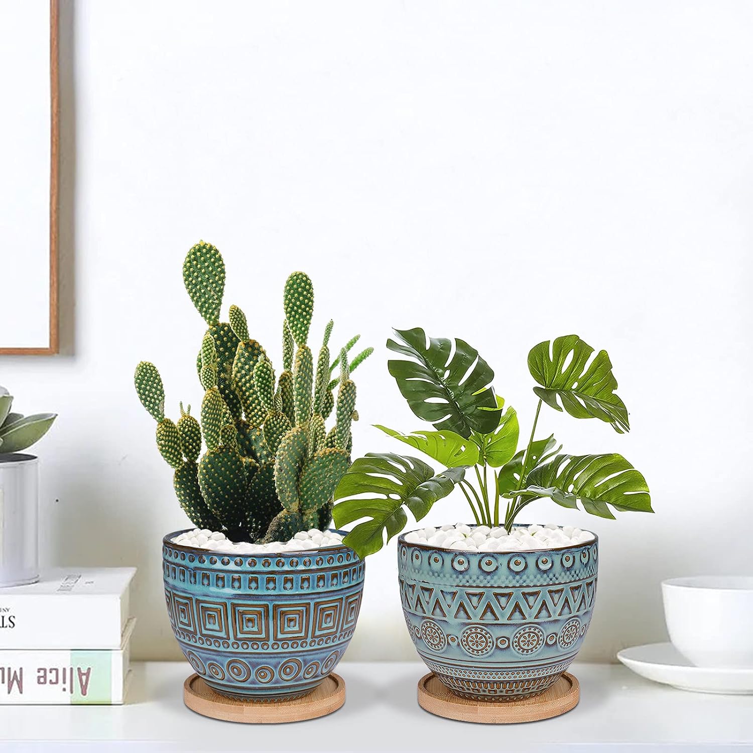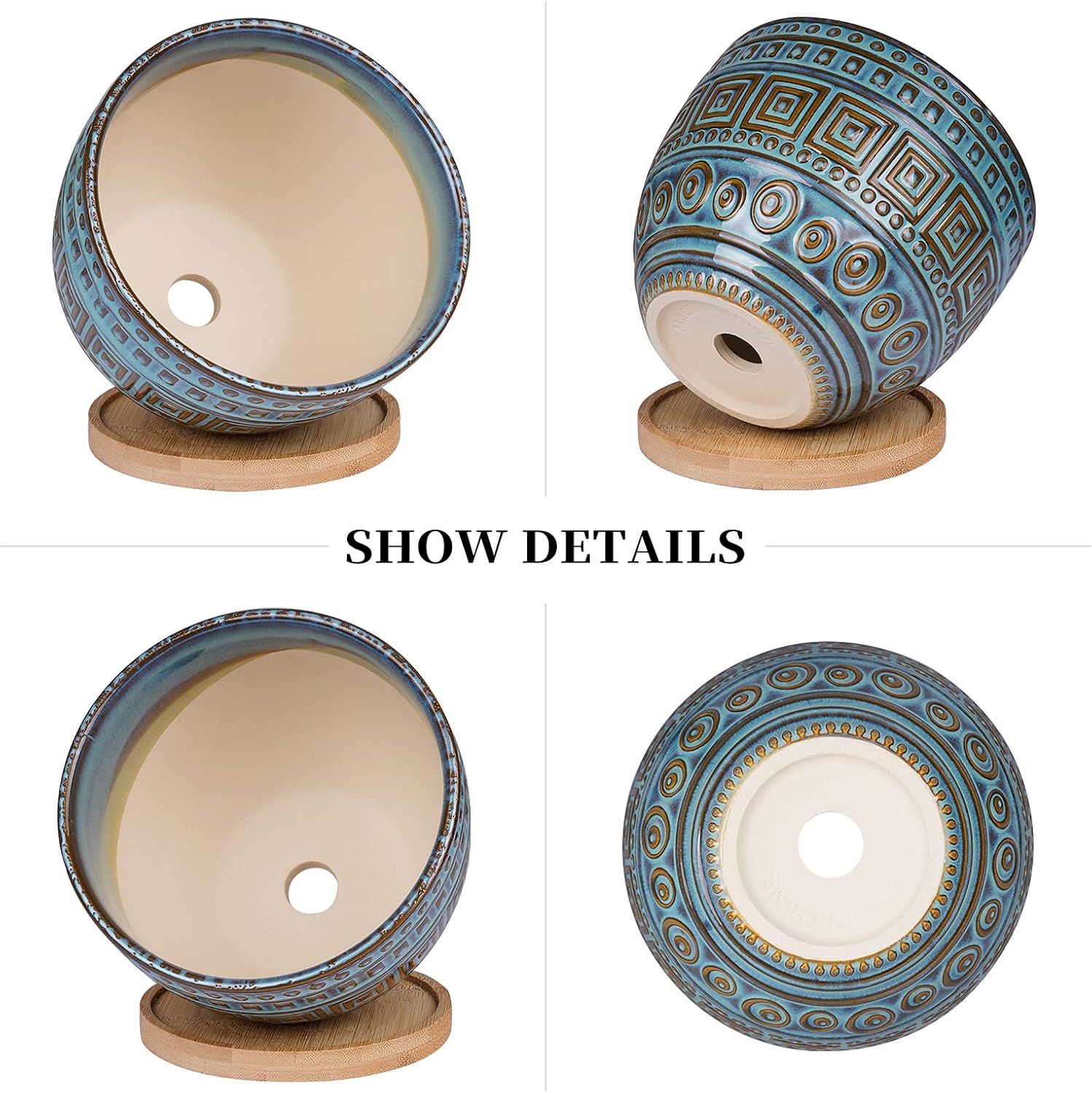 DRAINAGE HOLE & BAMBOO TRAY:Geometry ceramic planter bottom with drainage hole make promote plants breathing and drain off water.Inartificial bamboo wont scraped desk and keep it clean which is ecological and environmental,environment-friendly.Plastic drain grid decrease soil loss.