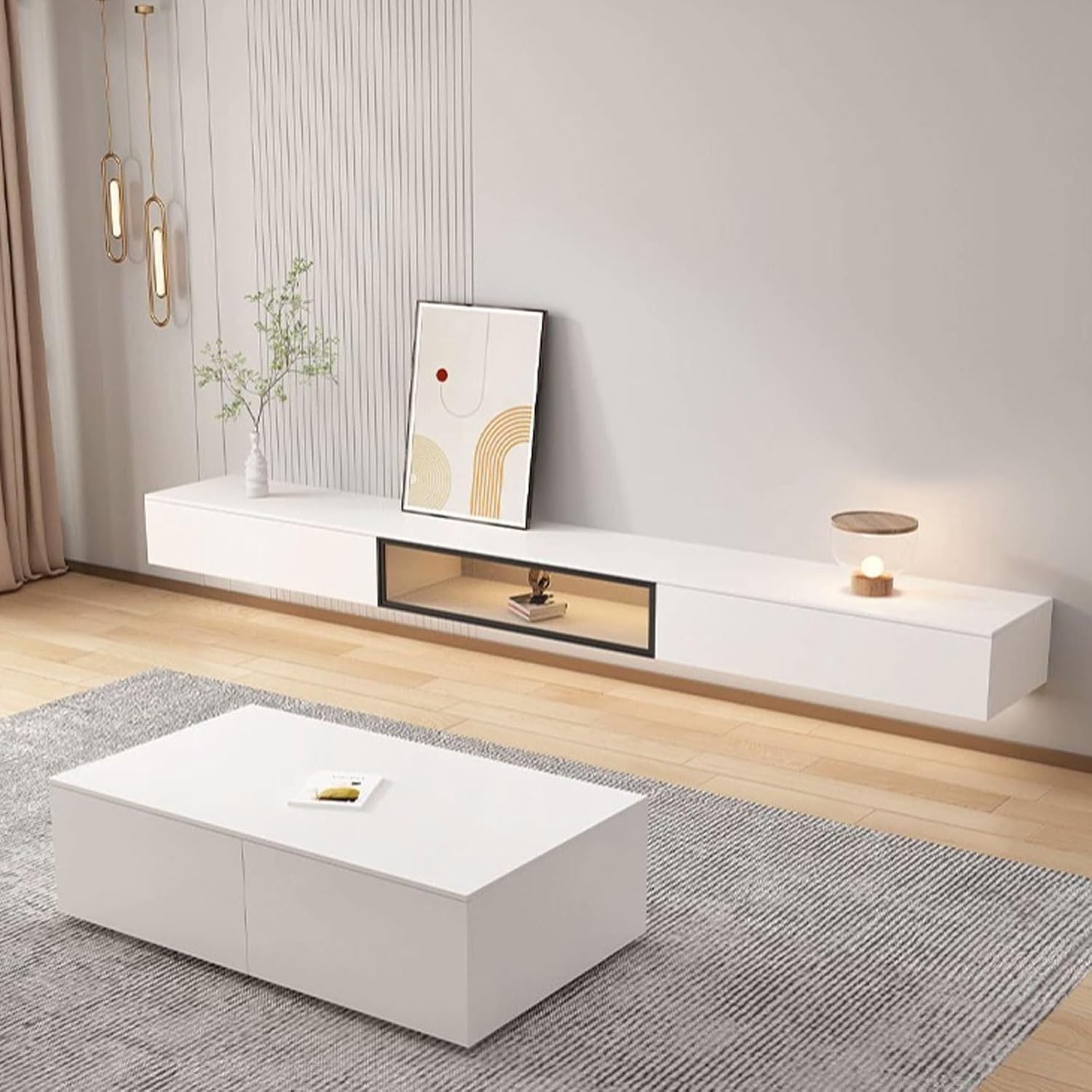 【High-Quality】 Comes with premium wood material and sturdy structure, the TV shelf with excellent craftsmanship; With durable and smooth finish on it, the floating TV cabinet is lightly textured; Water and abrasion resistance makes it easy to wipe off.