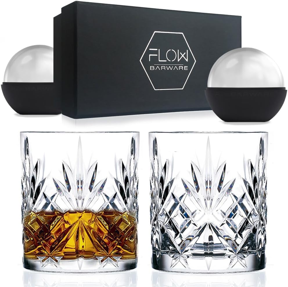 SET OF 2 LEAD FREE CRYSTAL WHISKEY GLASSES – This Classic Whiskey Glass Set offers modern style, with an air of the traditional. Inspired by the opulence of the 1920’s, these whisky glasses just ooze sophistication & are perfect for serving spirits & short cocktails, comes complete with 2x large ice ball moulds
