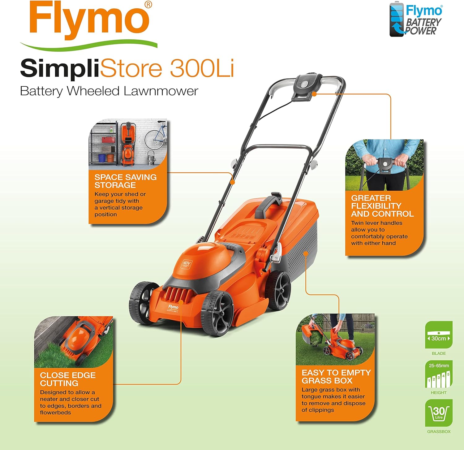 Designed for small to medium size gardens and powered by two 20V Li-Ion batteries to give 40V performance. The Flymo SimpliStore 300 Li is a 30cm battery wheeled lawnmower with essential features to make mowing simple with no restricting power cord for greater freedom & flexibility.