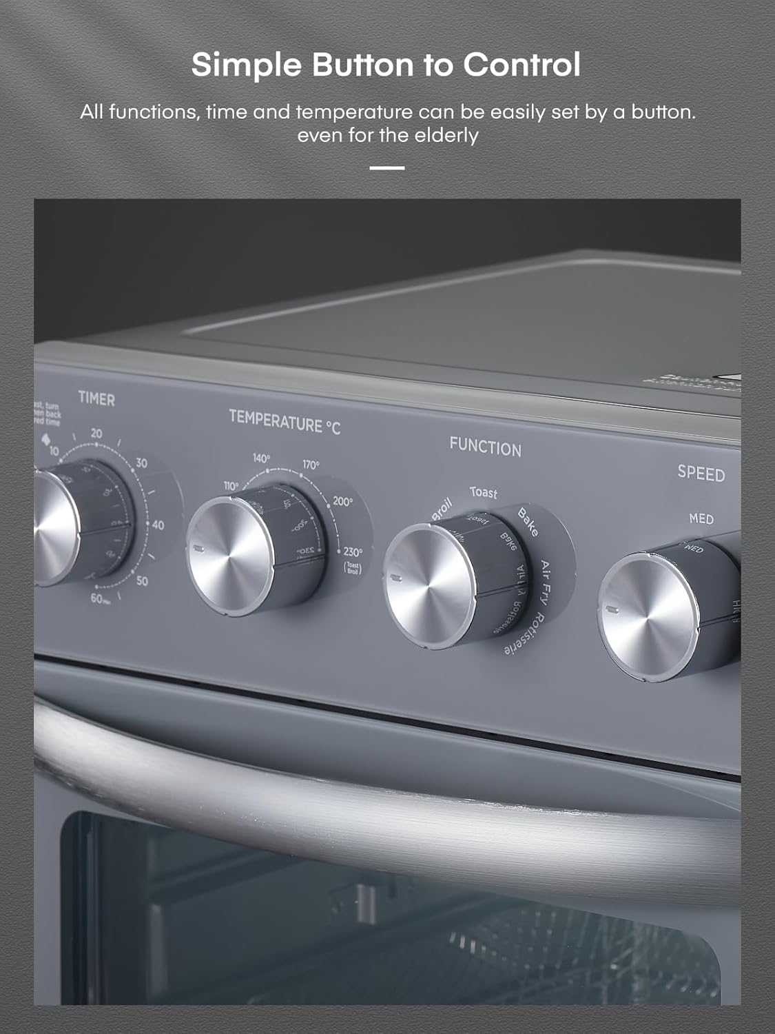 🍗 【Simple & Safe】The air fryer oven adopts double-layer heat-insulating glass, surrounded by safety insulation strip, with durable anti-scalding handle. Internal light for easy viewing. 4 buttons can adjust the temperature range 80℃- 230℃. And designed with a 60-minute smart timer. All the desired function can be set with one button. Mechanical buttons are more durable and simple to use, even for the elderly.
