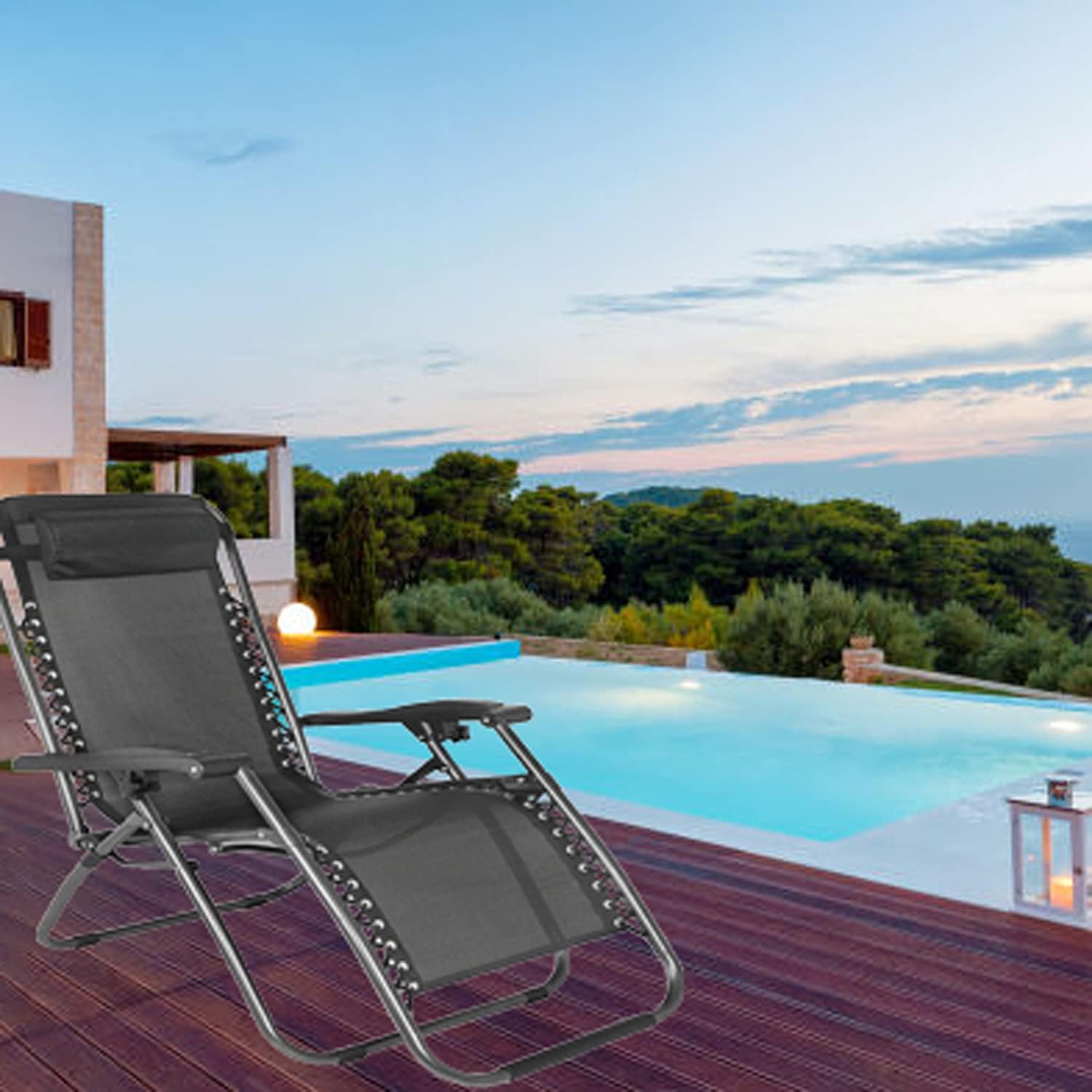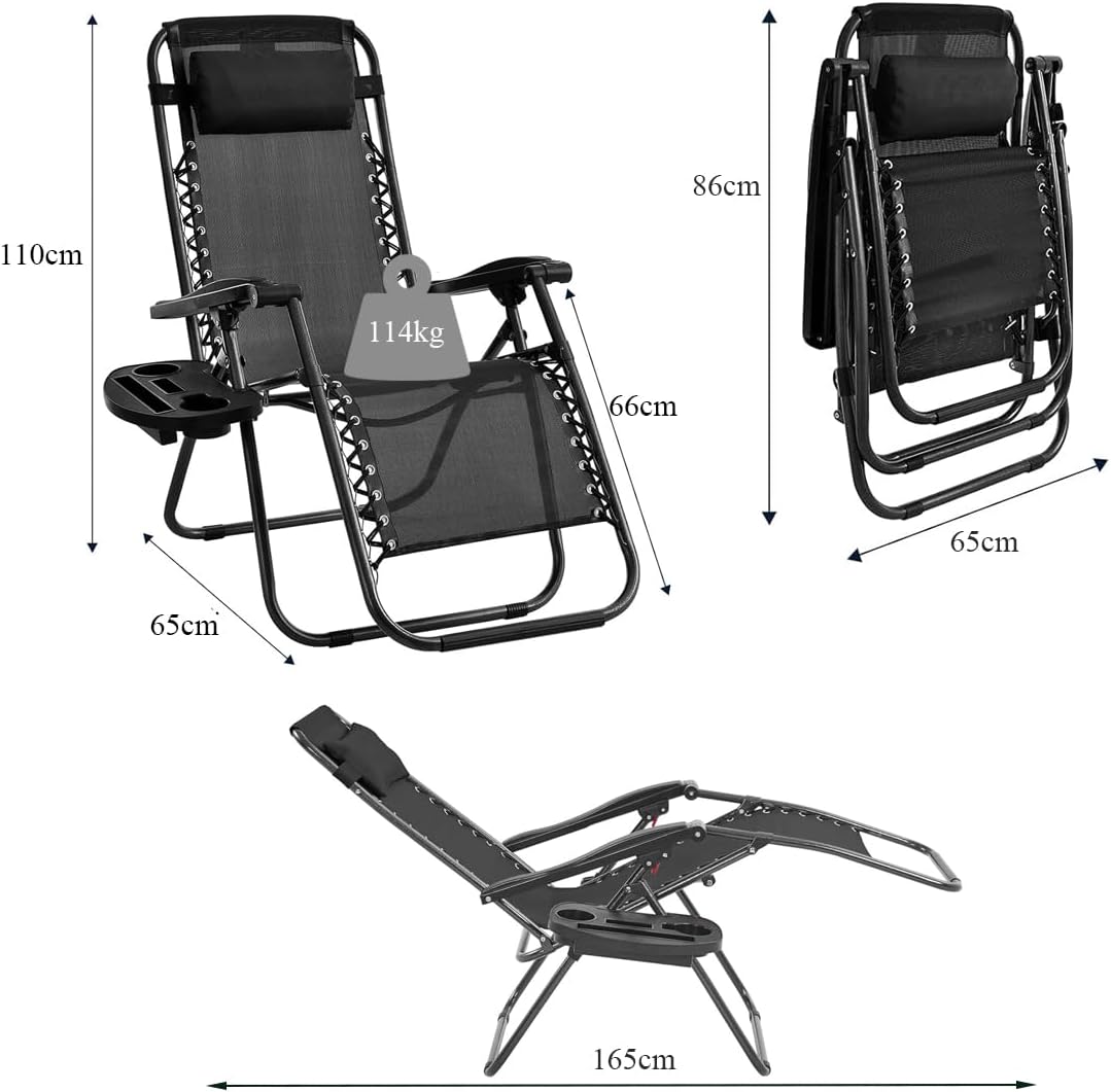 Folding Reclining Adjustable Zero Gravity Lounge Chair, Garden Chair Leisure Beach Chair with Headrest and Cup Holder, Sun Loungers Powder Coated Steel Frames, Sunlounger for Deck Chair, Patio,Black These Sun Loungers can be reclined from 0 to 170 Degrees making them ideal for summer snoozes. The ergonomic design locks in almost any position and comes complete with an adjustable padded headrest for your comfort. The recliner chair can be folded up easily for storage and portability, Ideal for gardens, beaches, camping, pools, patios or balconies.