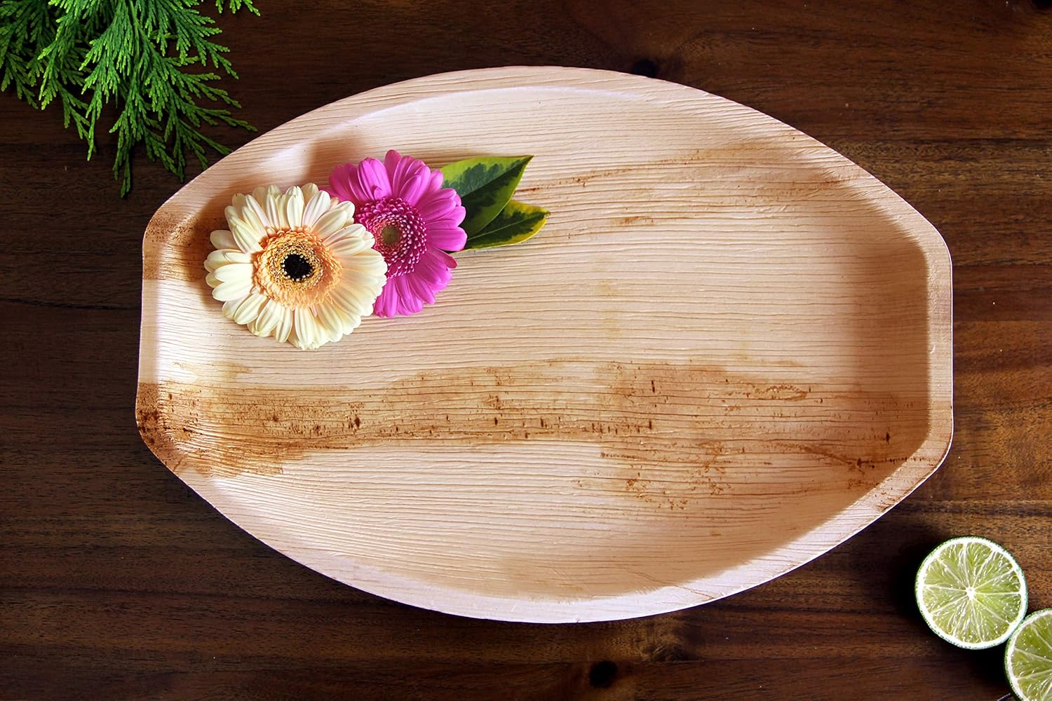 PREMIUM QUALITY and STURDY – Our strong disposable palm leaf serving trays do not bend or collapse under weight and you can hold your food confidently with one hand. Suitable for any type of food – hot, cold, dry, wet, sticky, sweet, spicy – you name it!
