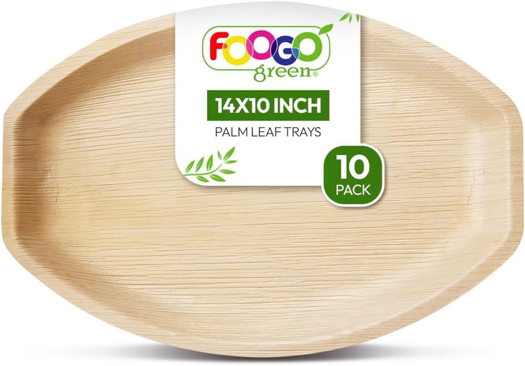 FOOGO Green 10 Disposable Palm Leaf Serving Trays, Large Oval 14″x10″ (35cmx25cm), Platters Starters Canape, Charcuterie Board, Like Wooden Trays, Sturdy Hot Food Trays, Eco-Friendly Food Trays