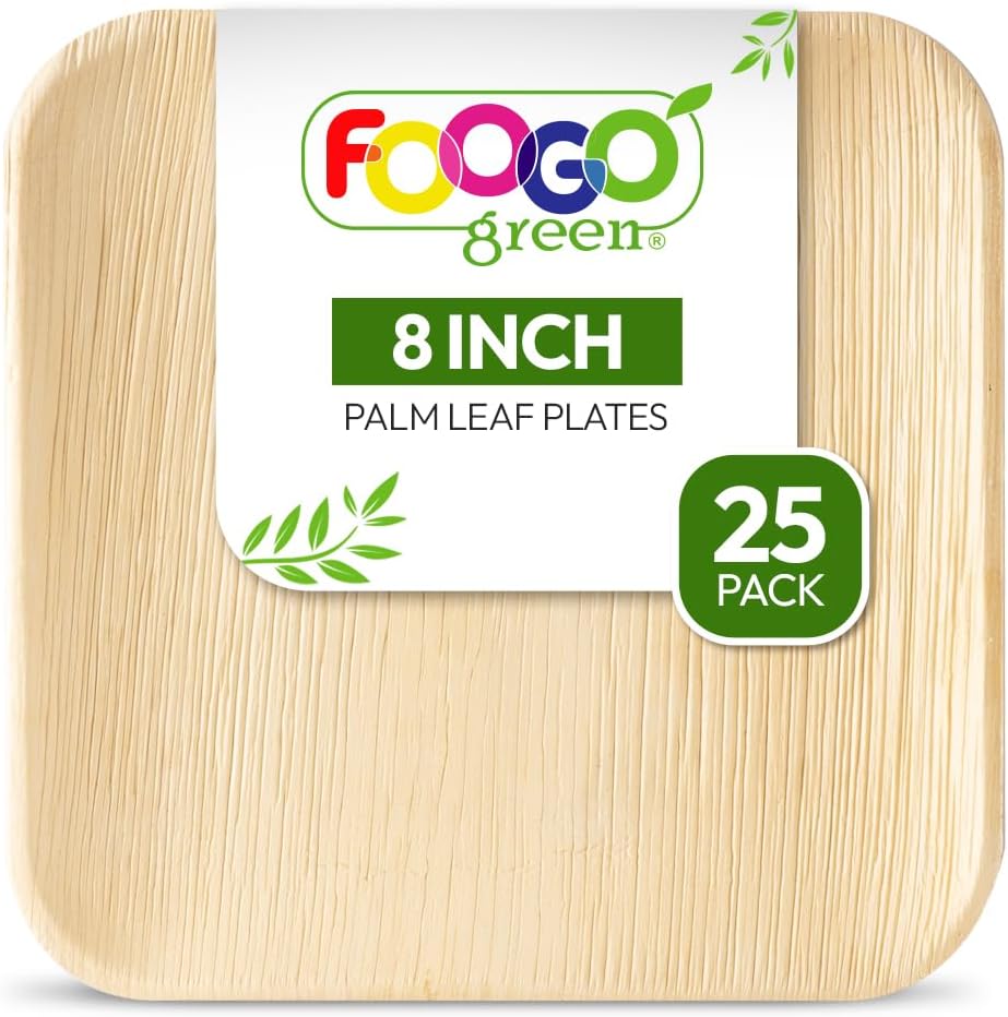 FOOGO Green 25 Disposable Palm Leaf Plates, 8″(20cm) Medium Square, Eco Friendly Biodegradable Compostable Plates, Like Wooden Plates, Bamboo Plates, Paper Plates Hot Food, Wedding Party Plates Picnic