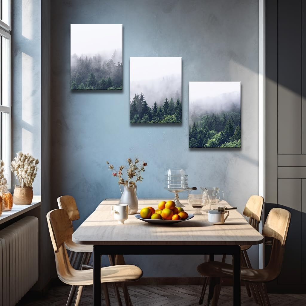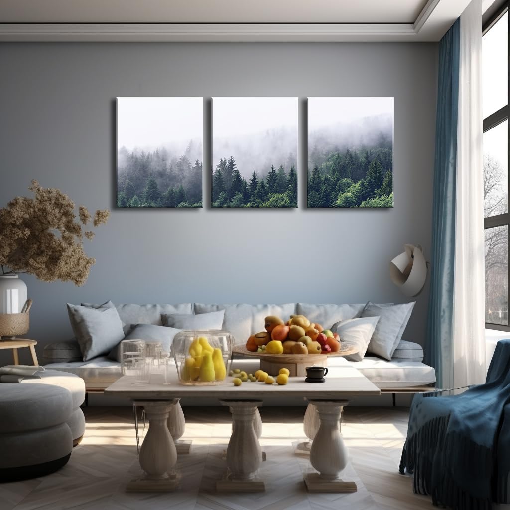 “Forest Landscape Canvas Wall Art – 3 Panels Misty Mountain Foggy Tree Forest Print Poster Wall Decoration for Home Office Living Room Bedroom Modern Artwork Framed Painting Ready to Hang 12×16 inch