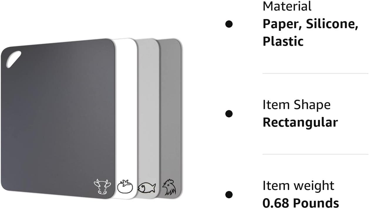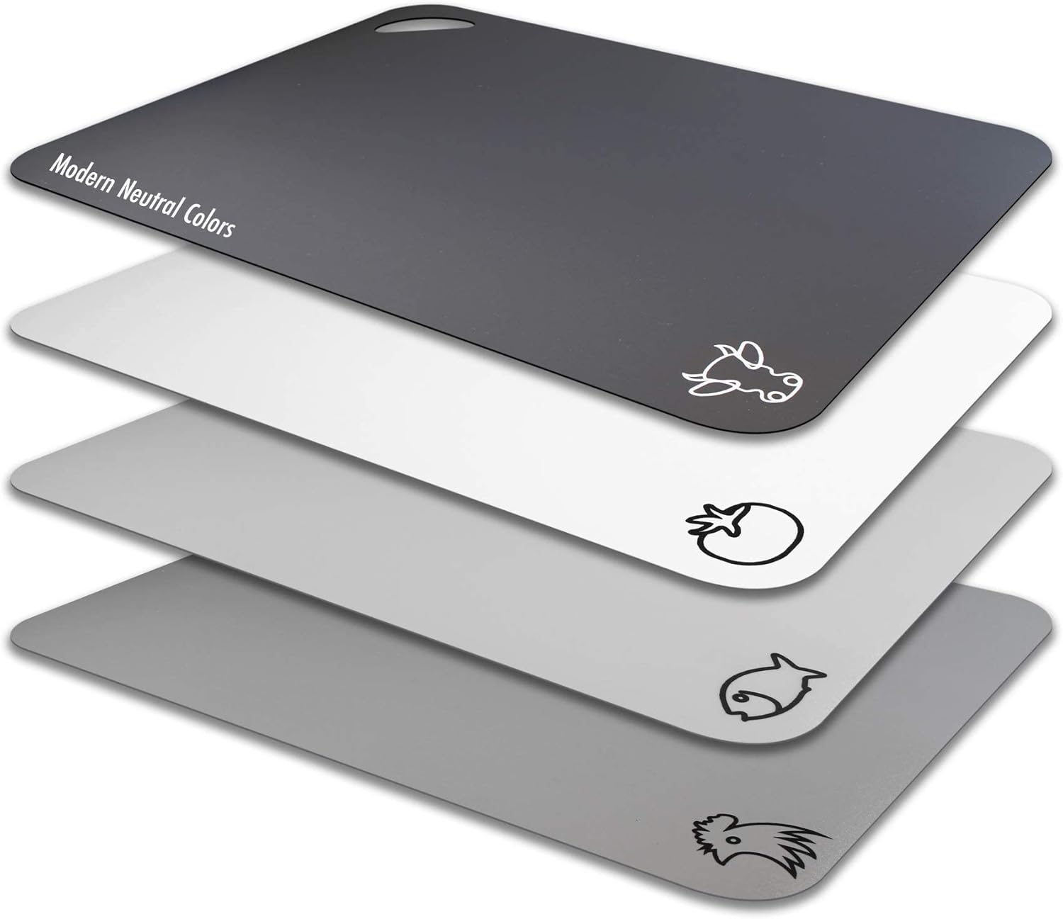 UNIQUE MODERN COLORS WITH FOOD ICONS: Combine beautifully with modern contemporary kitchens. Decorative black, white, dark grey and light grey will beautify your kitchen and also provide color coded for meat, vegetable, fish, bread or fruit. These cutting boards is helpful to keep the food original and avoid mixing food flavors caused by mixing cutting board while cutting food.