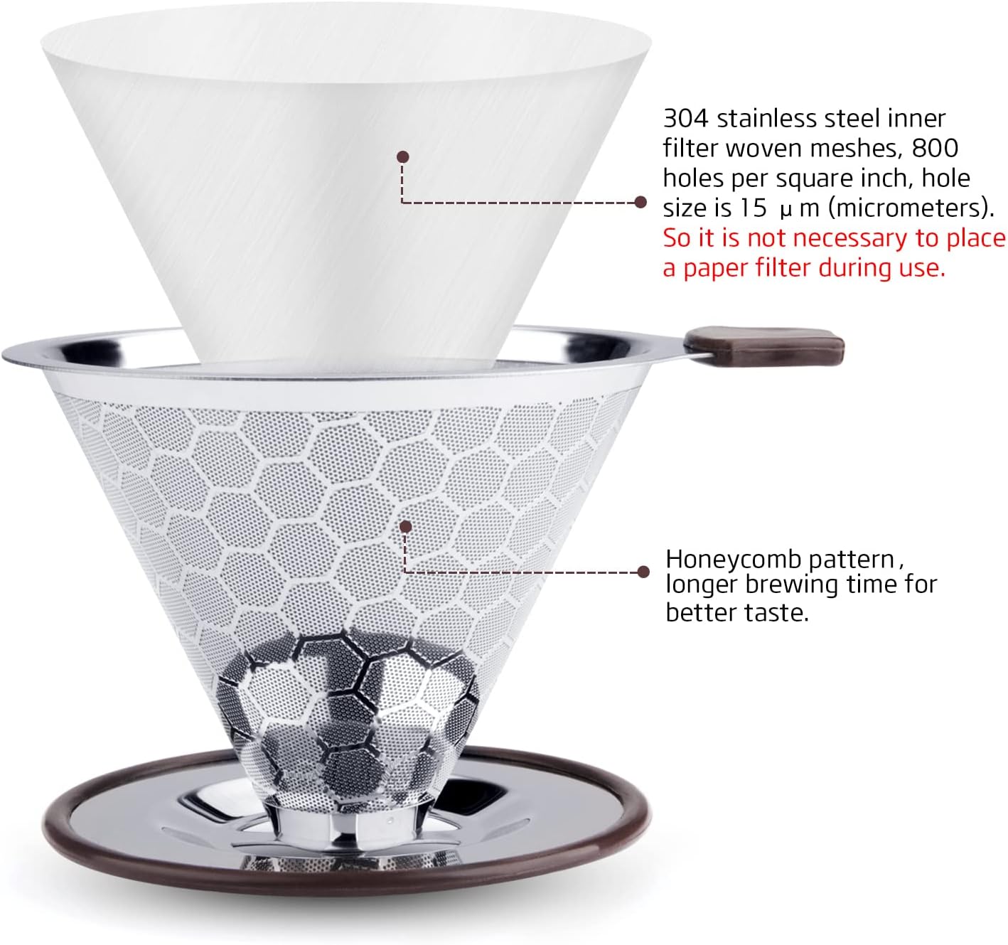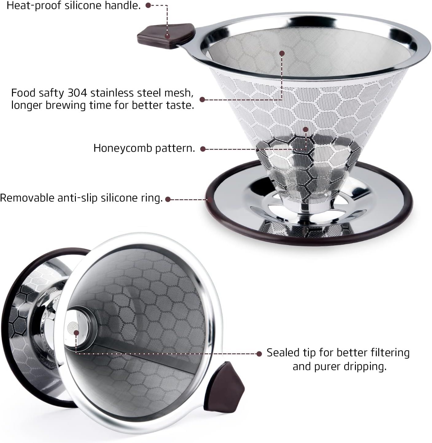 FOXAS Pour Over Coffee Filter Stainless Steel Reusable Coffee Dripper Paperless Drip Cup Coffee Maker Stainless Steel Coffee Filter