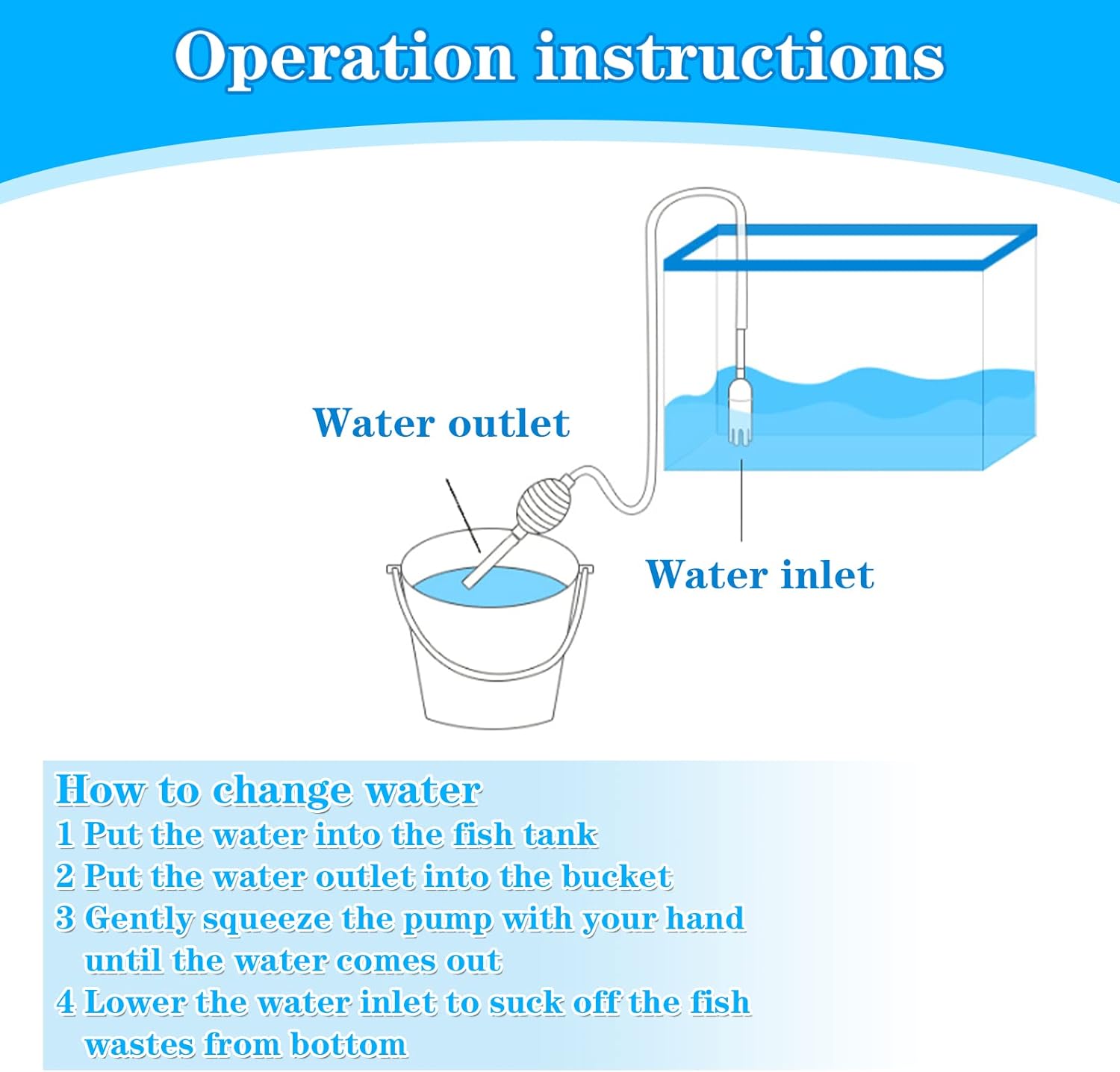 Easy to use: Just put the water suction port into the fish tank, then squeeze the blue pump ball more than 6 times, the water will be automatically discharged under pressure.