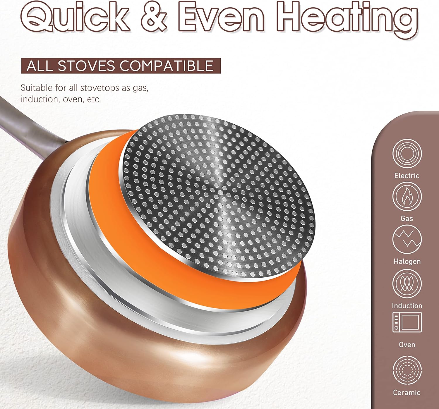 ✅【Ergonomic Handles & Oven Safe】Lengthened ergonomic stainless steel handles, with enough air flow, can conduct heat more slowly and dissipate heat more quickly. Temperature-resistant pots can be used in the oven, Safe Up to 450°F. If it get VERY HOT, please use proper proection before touching the pan, such as a Oven Mitt. Lids can be placed upside down, easier your daily kitchen cleaning