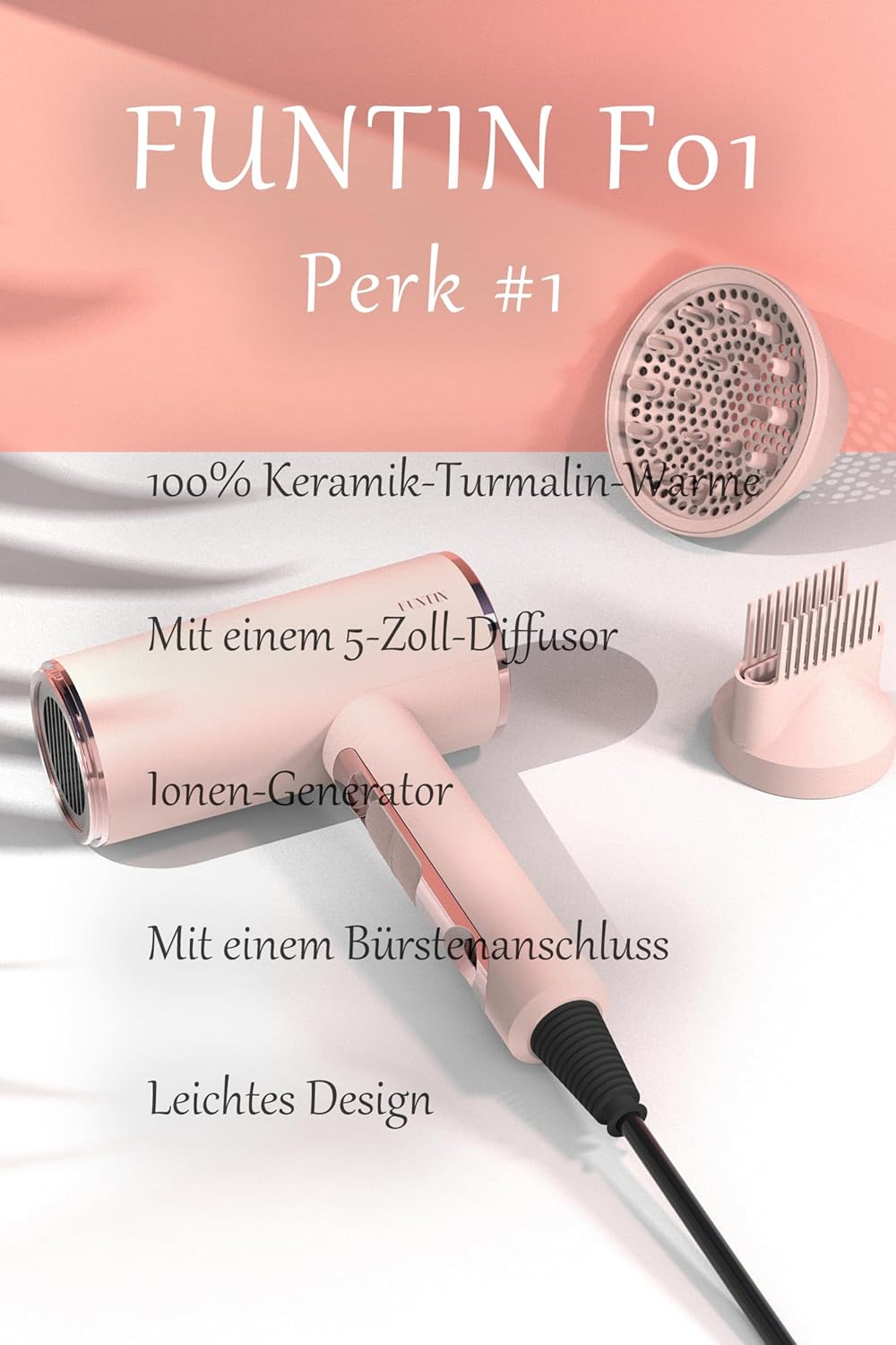 FUNTIN 2200W Hair Dryer with Diffuser Brush Nozzle Ionic Blow Dryer Powerful Baby Pink