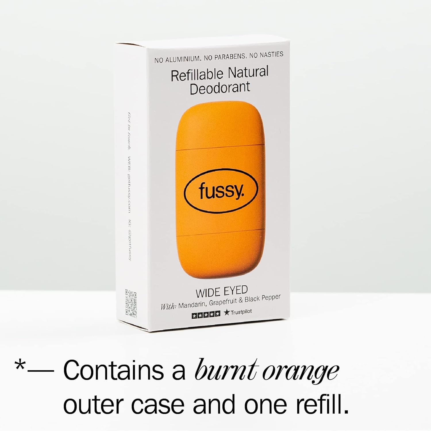 Fussy – Natural Refillable Deodorant – Aluminium Free – 24 Hour Protection – Citrus Scent & Burnt Orange Case – Mandarin, Grapefruit & Pepper – Vegan & Cruelty Free – 100% Natural & Effective