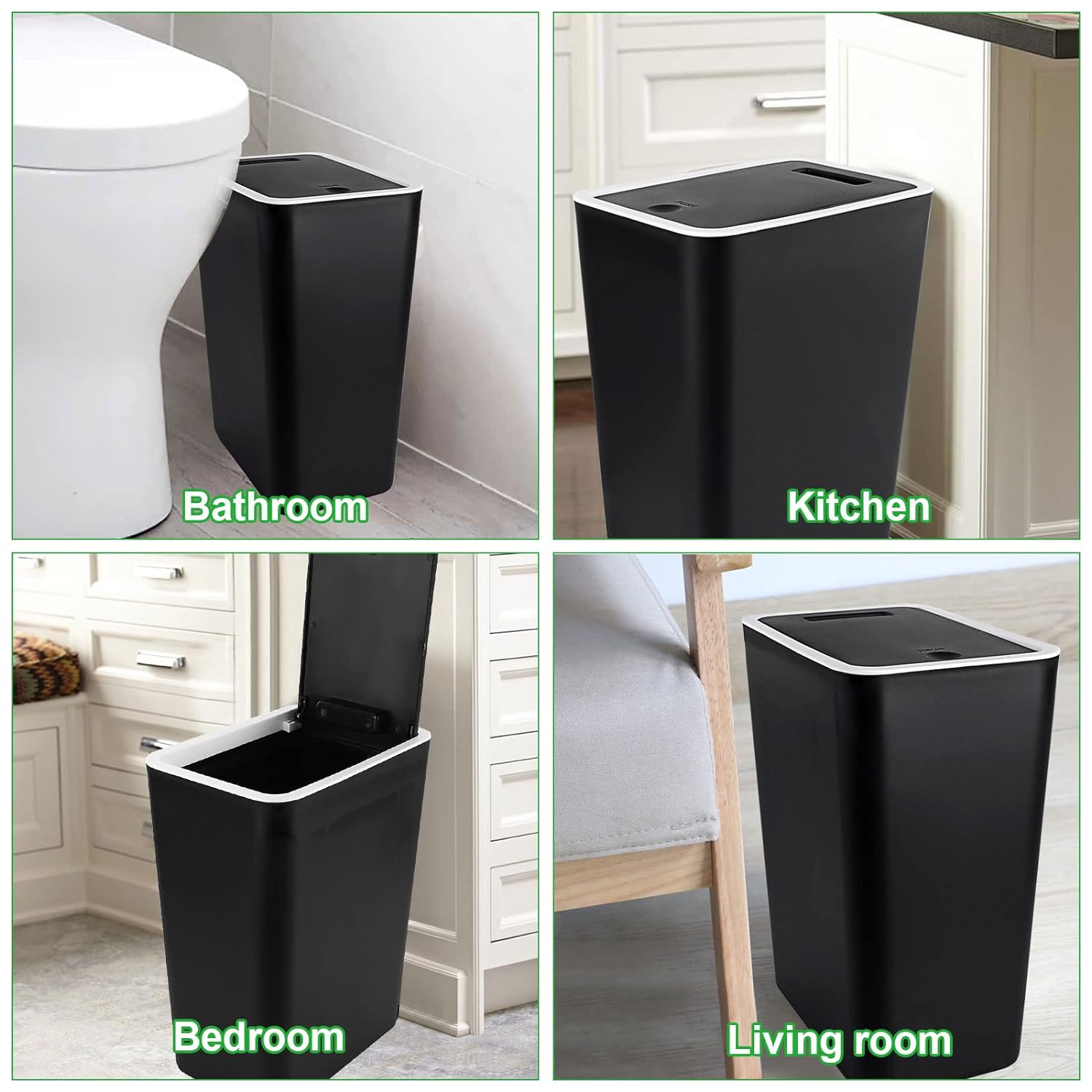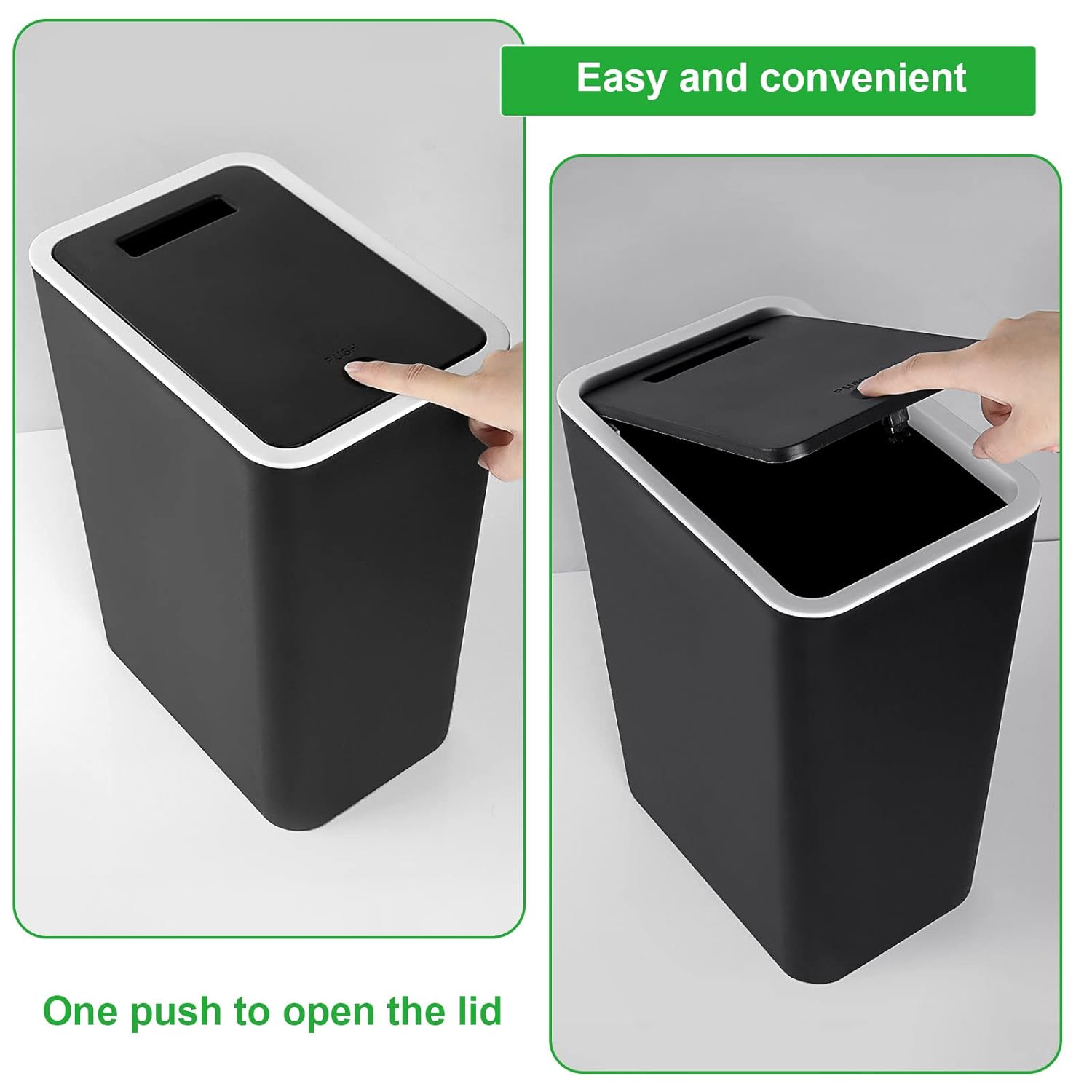 HIGH QUALITY MATERIAL: The waste bin is made of high quality PP plastic, sturdy and durable. The surface is waterproof and easy to clean.
