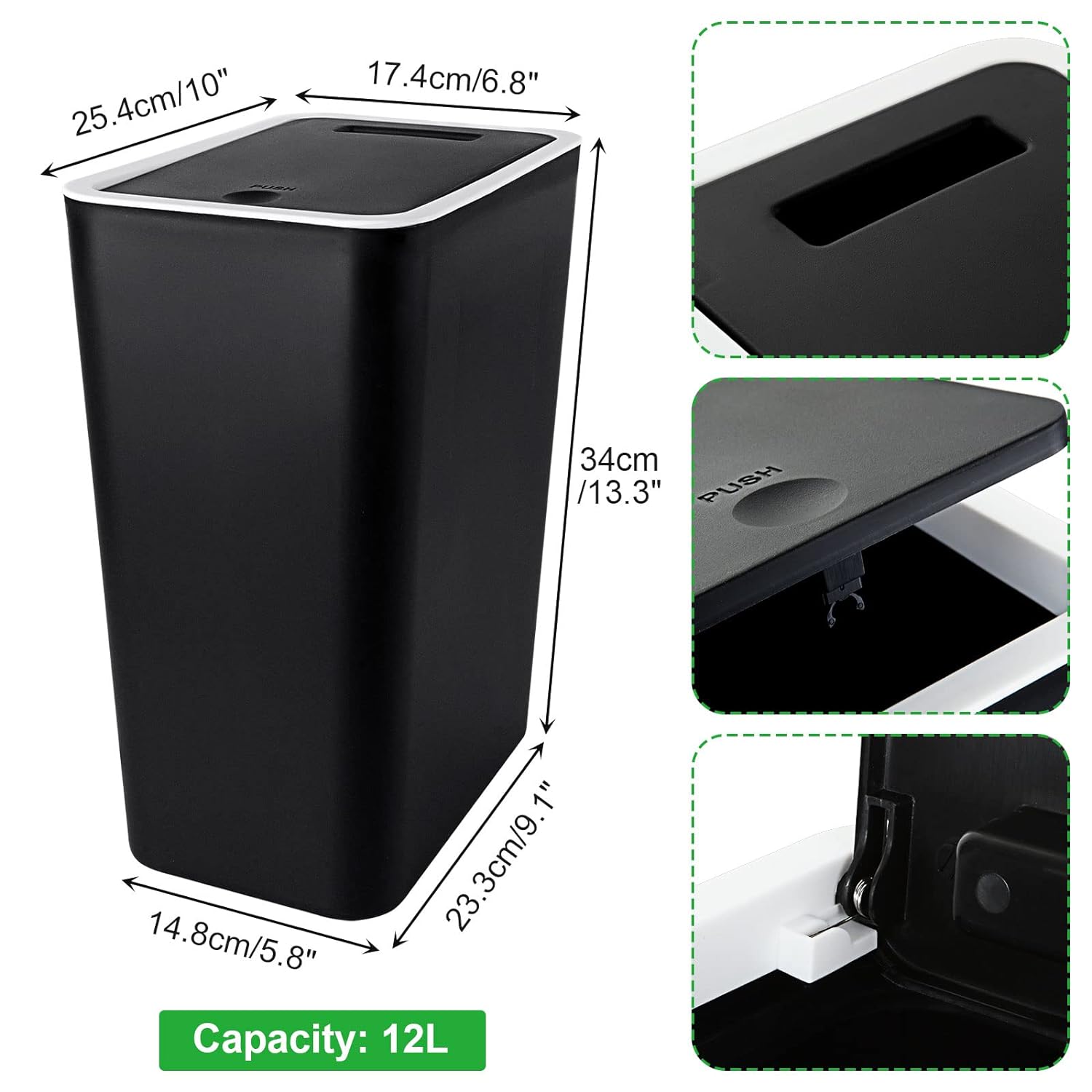 SIZE: 25.5 x 17.5 x 34.5CM, compared to other small garbage bins, our push top lid bin has a capacity of 12L.