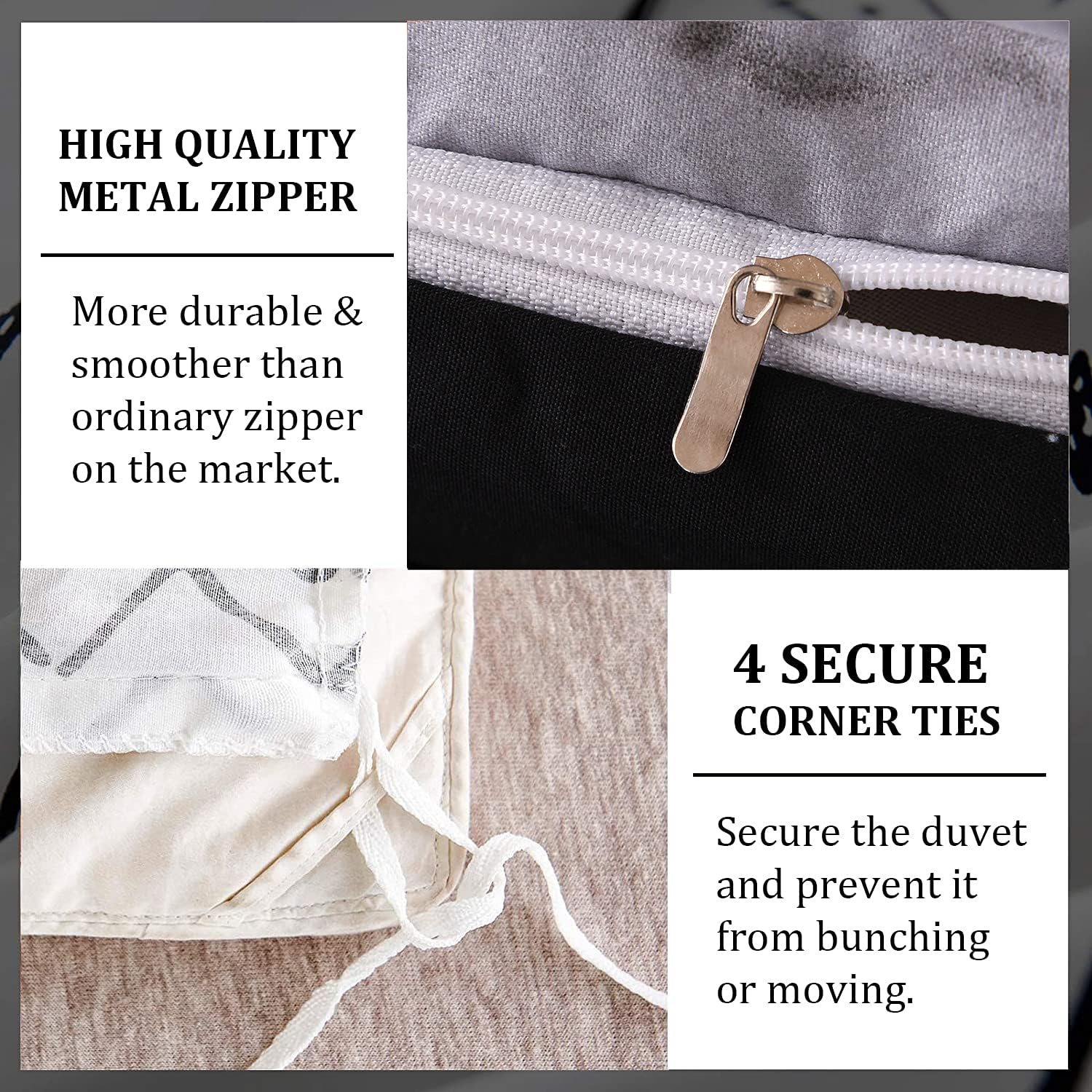 QUALITY METAL ZIPPER & TIES- Hidden zipper closure to seal your luxury comforter, which safer and easier than regular button closure; 4 corner ties to secure your comforter in place firmly; Envelope closure design pillowcases allow you to get your pillow In & Out conveniently.