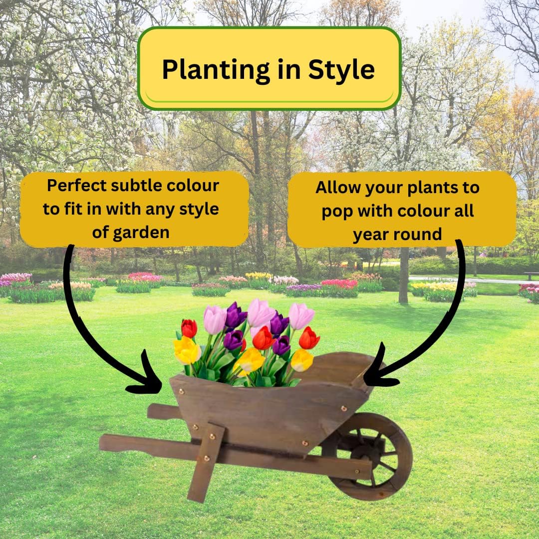 Durable – These wheelbarrow planters are crafted from hard wearing and weather proof pinewood, lined with a plastic liner to ensure long lasting quality and practicality all year long. Crafted with care, they will look great come rain or shine!
