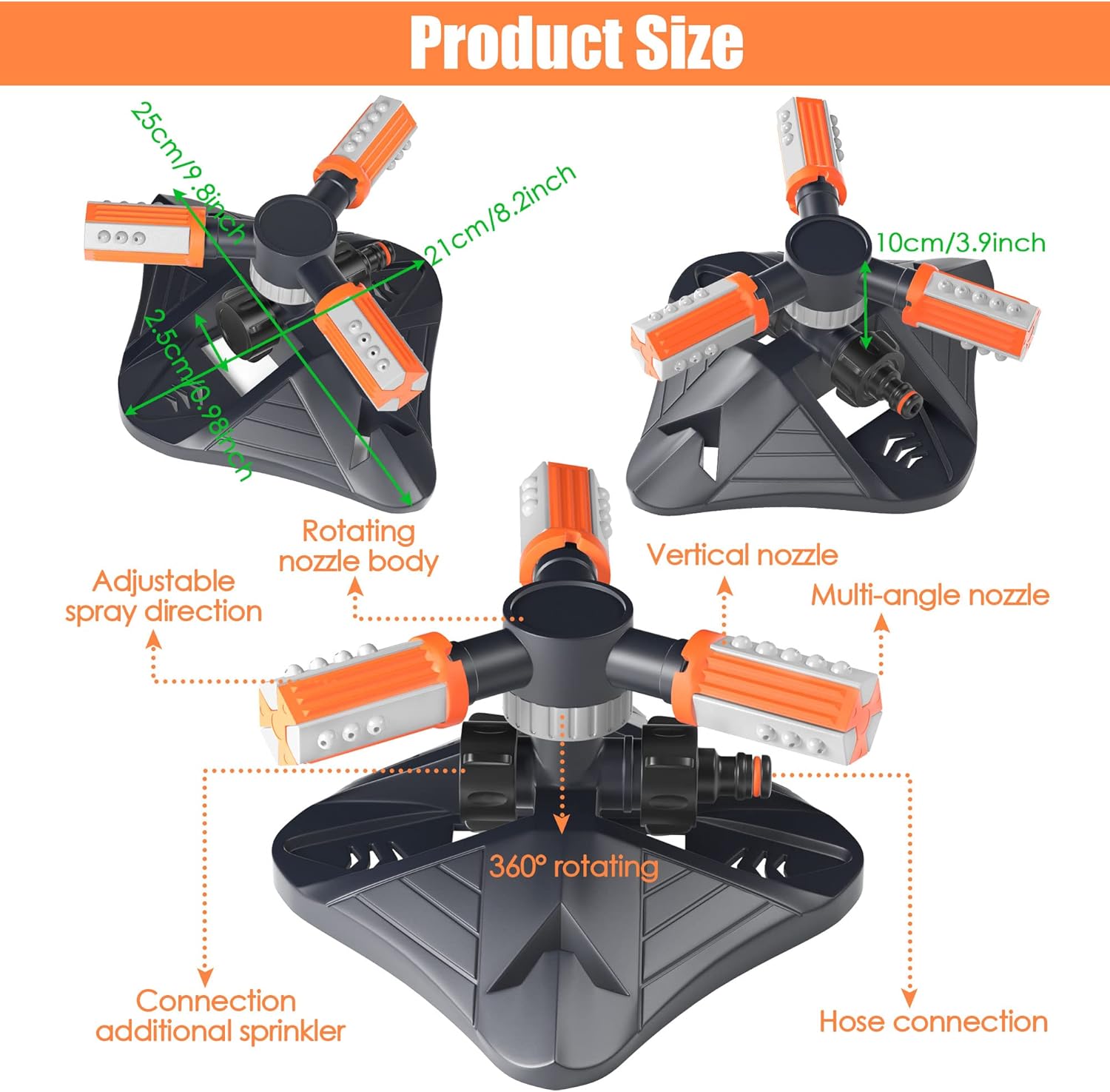 Tips-The garden sprinkler is assembled need, do not screw too tight when install the nozzle body to the base and ensure meet the lowest 28.4 PSI water pressure, check the nozzle patterns have adjusted to the right position on rotating arms before working, increase the water pressure if used the sprinkler in series.