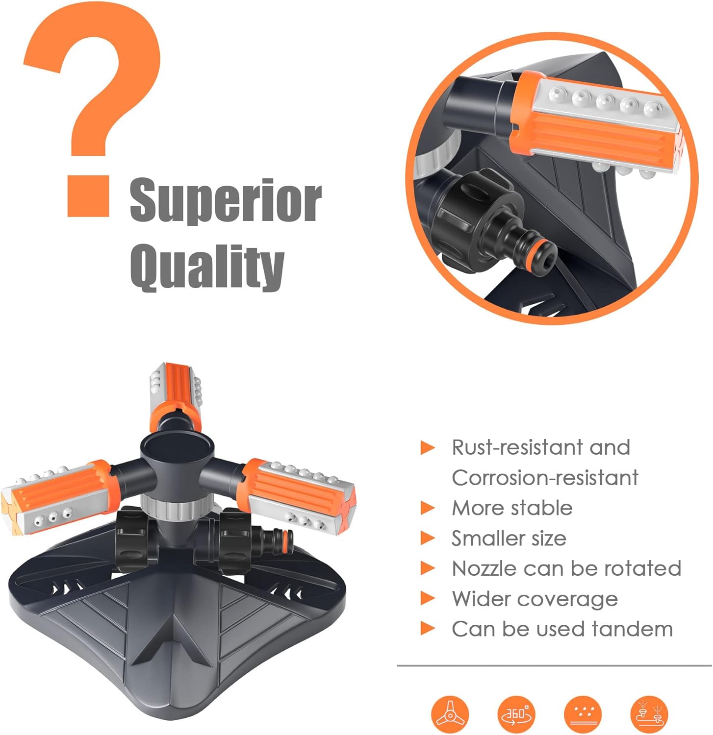 Wide Coverage-The garden sprinkler itself is 360 degree rotary and designed with 3 adjustable arms. Covering up to 3600 square feet evenly, it can spray a distance of 32.8 feet to 49.2ft with 80 PSI water pressure. It is very suitable for a family to play in the yard with pets, or to water your garden!