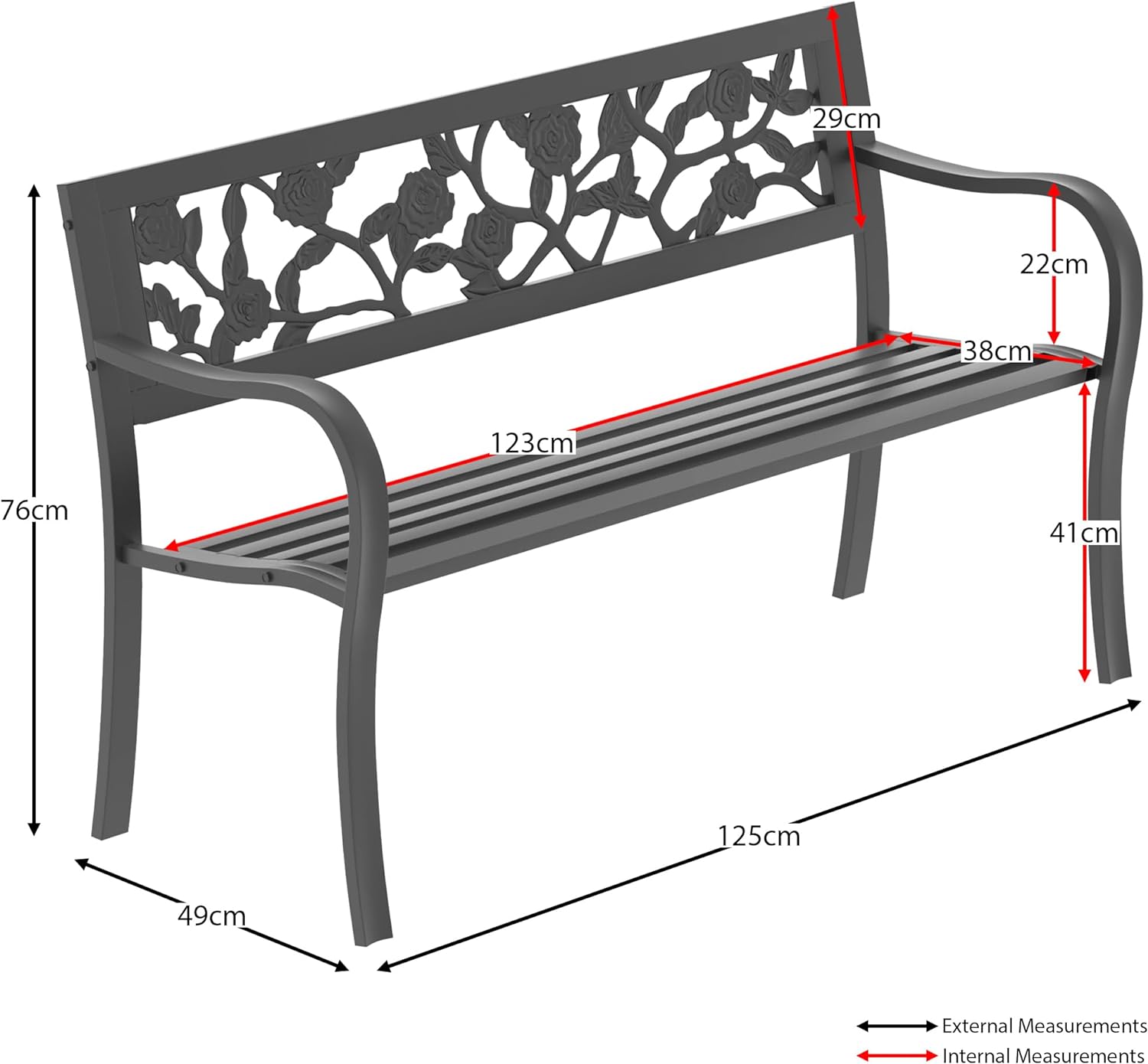 Durable Construction: Crafted from high quality steel, the garden bench with a rose design ensures durability and long lasting performance. The robust construction is ideal for outdoor use, providing a sturdy and reliable seating solution for your garden or patio.