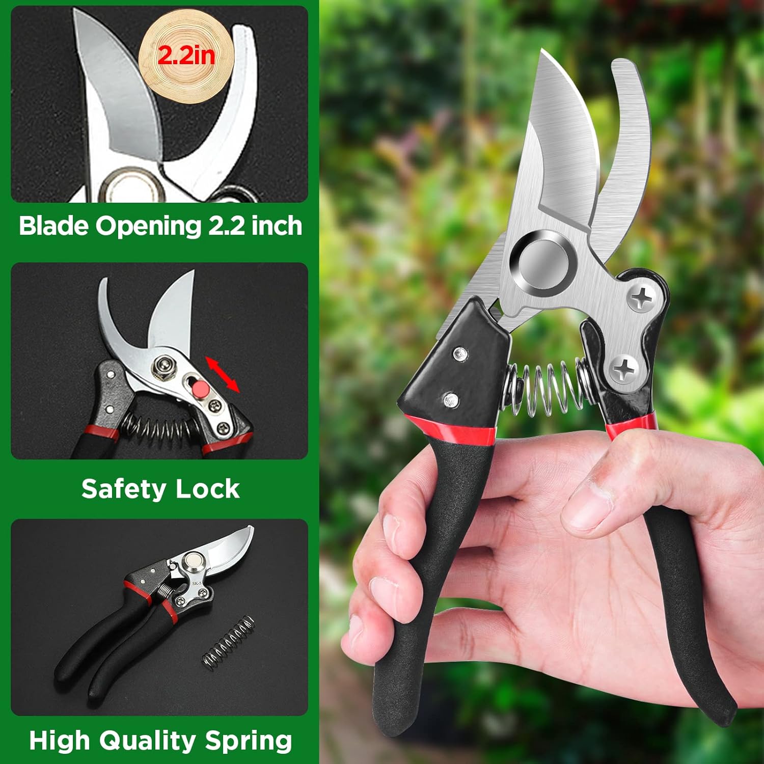 Hand Rake: Hand rakes work wonders for weeding, raking leaves and debris, aerating the soil and loosening the soil.Cultivator: The cultivator works great for aerating, cultivating, and loosening soil.Large Trowel: The trowel makes gardening easy and is suitable for all digging tasks including planting, removing plants, mixing soil and more.Pruning Shears: Be suitable for pruning flowers, houseplants, bonsai, vegetables, hydroponics etc. The pruning shears are also equipped with a safety lock that allows them to be engaged and released with one hand. Package Included: