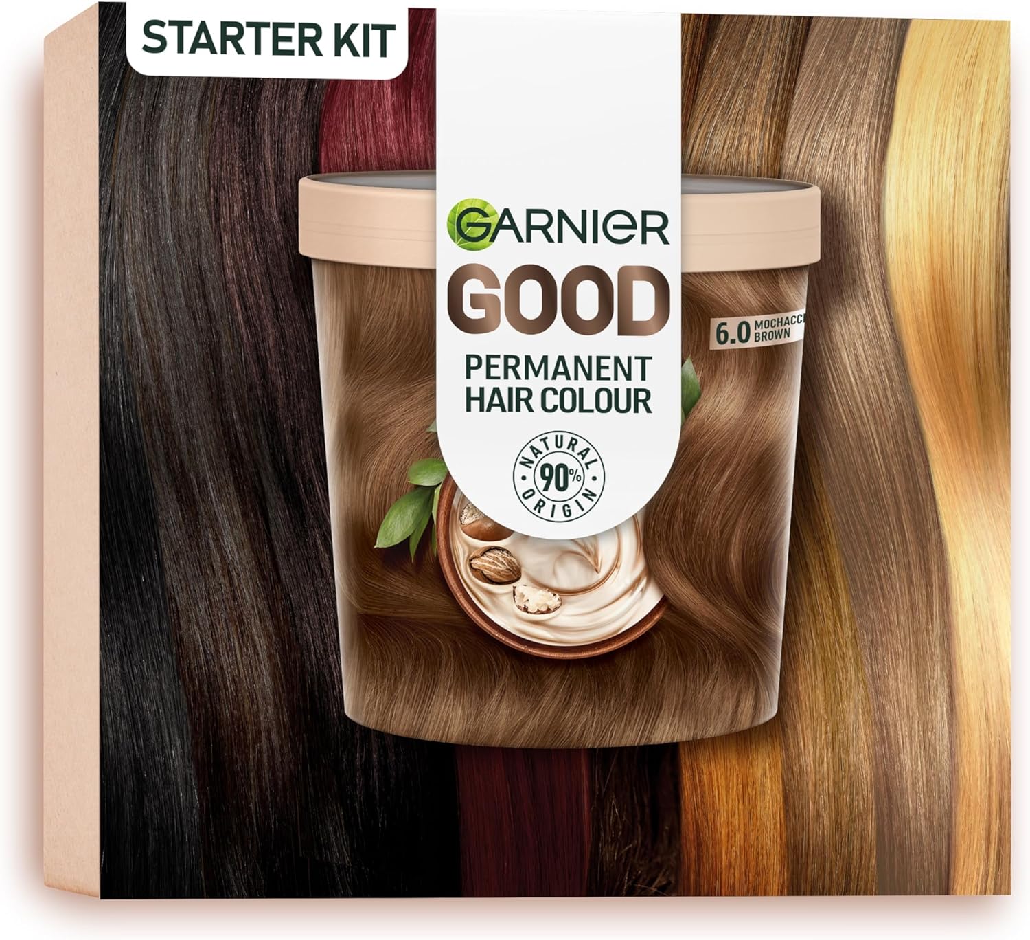 Garnier Good Permanent Hair Dye Premium Starter Kit, 6.0 Mochaccino Brown, Up To 100% Grey Coverage, 8 Weeks Long-Lasting Colour, No-Drip Application